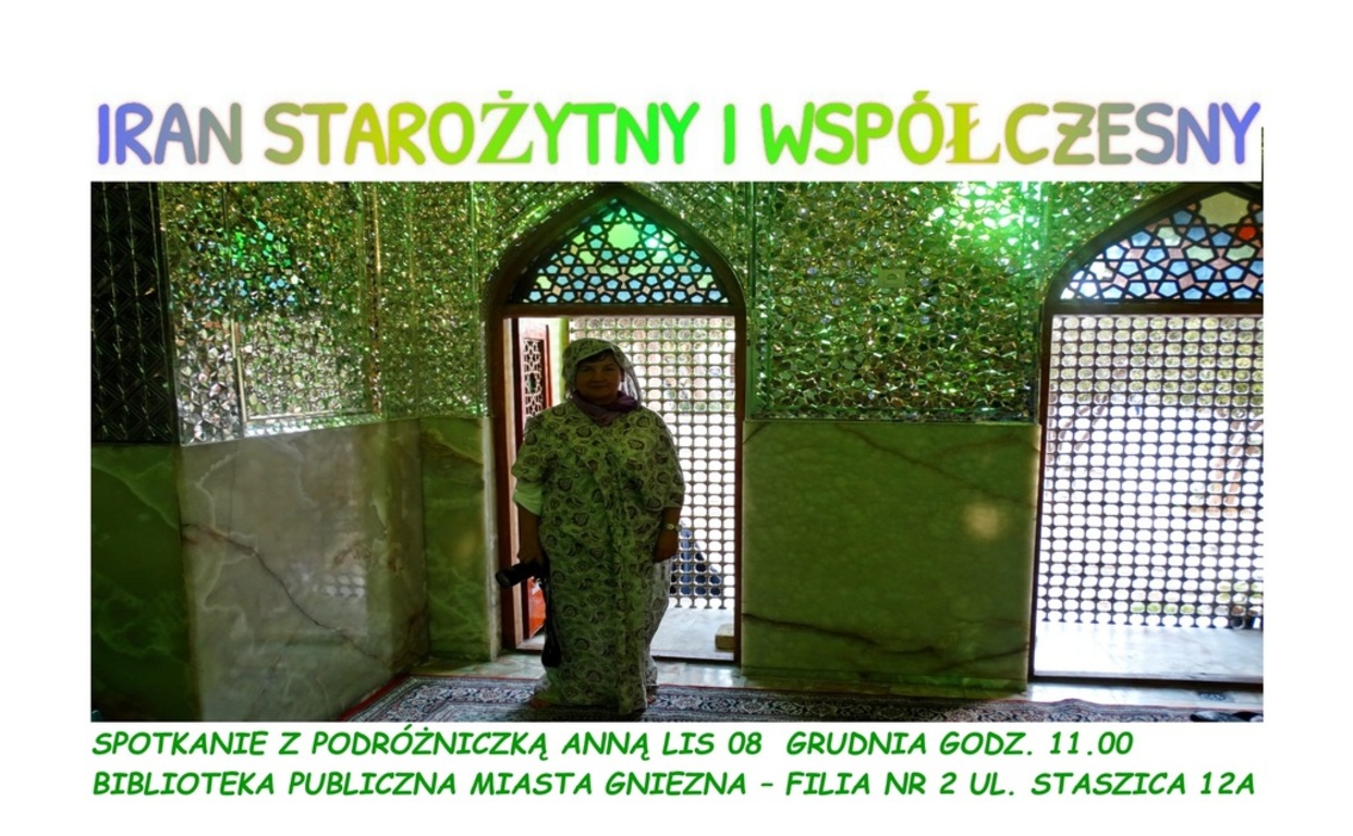 Zapraszamy na spotkanie z gnieźnianką Anną Lis, która opowie o wyprawie do Iranu. Podróżniczka pojechała tam, aby sprawdzić, ile prawdy jest w obrazie tego kraju przekazywanym przez media. A nie będzie to prelekcja o wielkobudżetowej wyprawie, na którą trzeba poświęcić miesiące przygotowań i zasobny budżet. To wspomnienia z wyjazdu, na który może sobie pozwolić każdy, rezerwując kilkanaście dni urlopu i budżet równowarty przeciętnym wczasom nad polskim morzem.