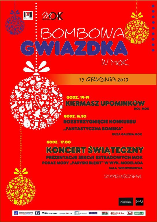 17 grudnia 2017 roku, o godzinie 17.00, odbędzie się Koncert Świąteczny „Bombowa Gwiazdka”. Zgodnie z tradycją zaprezentują się na nim sekcje estradowe Miejskiego Ośrodka Kultury w Gnieźnie. Będą to zespoły wokalne oraz grupy taneczne, nie zabraknie pokazu Zumby. Na koniec koncertu przewidziany jest pokaz mody „Paryski błękit” w wykonaniu sekcji Modelada, która powstała z inicjatywy Stowarzyszenia Ośla Ławka. Zajęcia z projektowania ubioru prowadziła Joanna Ryczkowska, twórczyni marki odzieżowej Riczi. Głównym odbiorcą koncertu są rodziny uczestników sekcji, które chcą zobaczyć osiągnięcia swoich pociech.