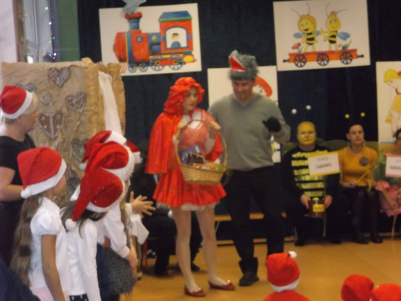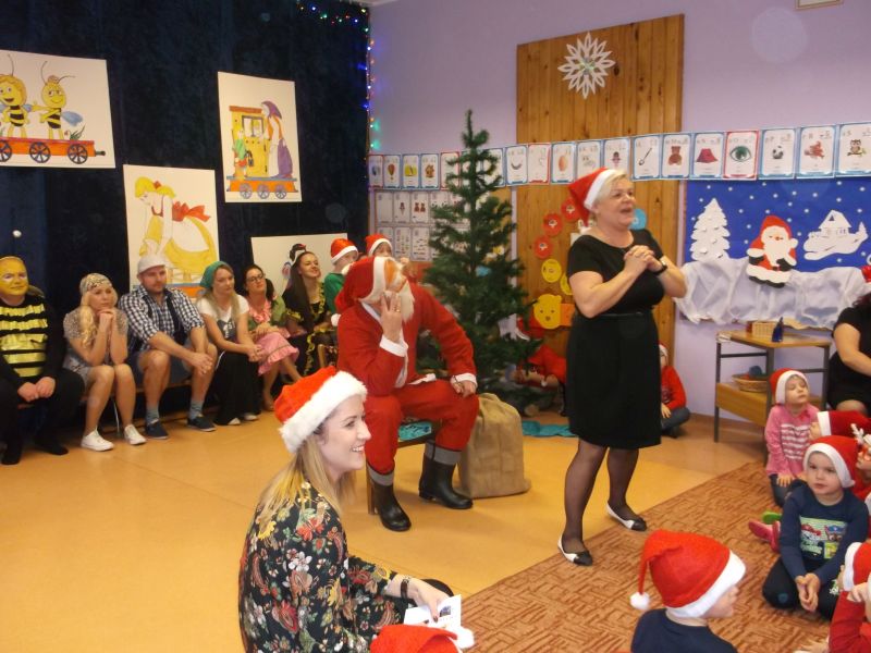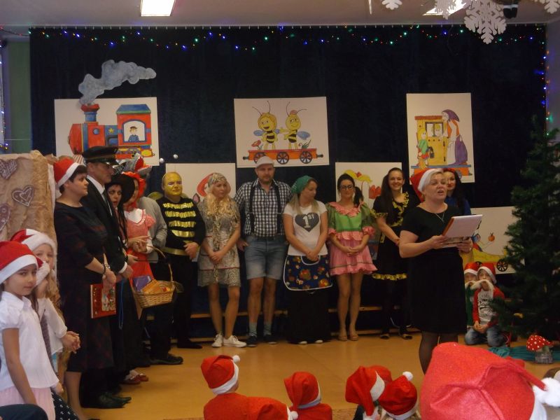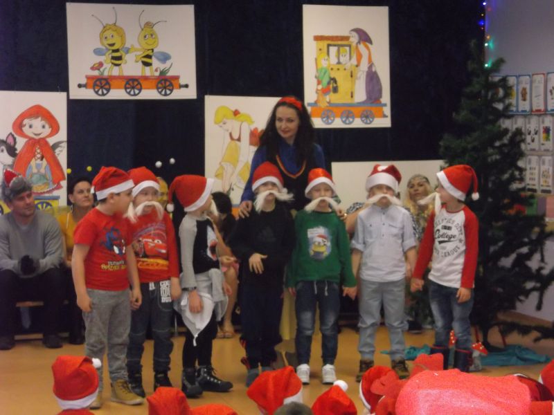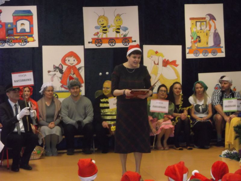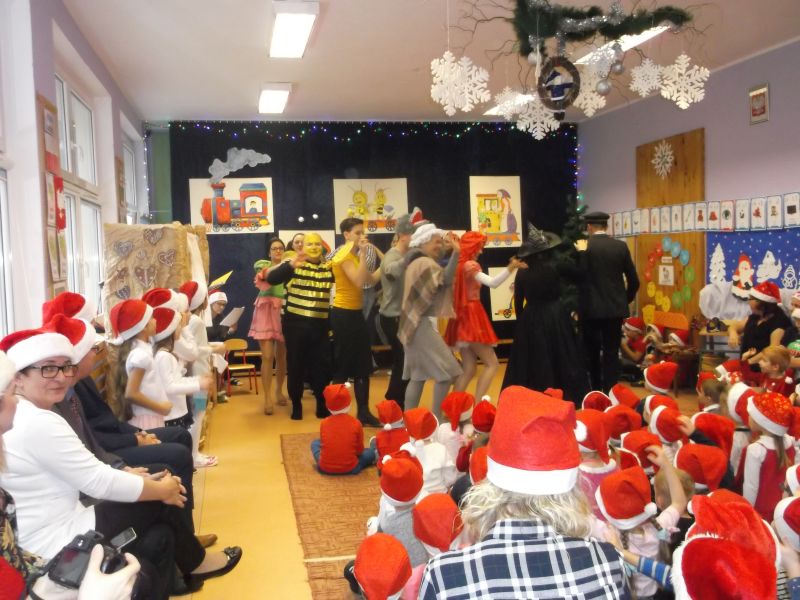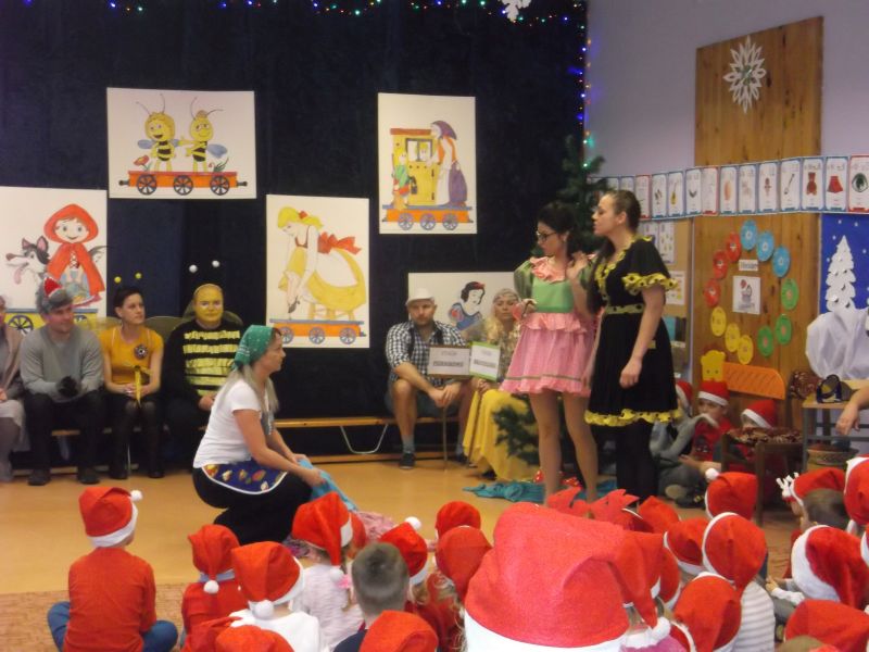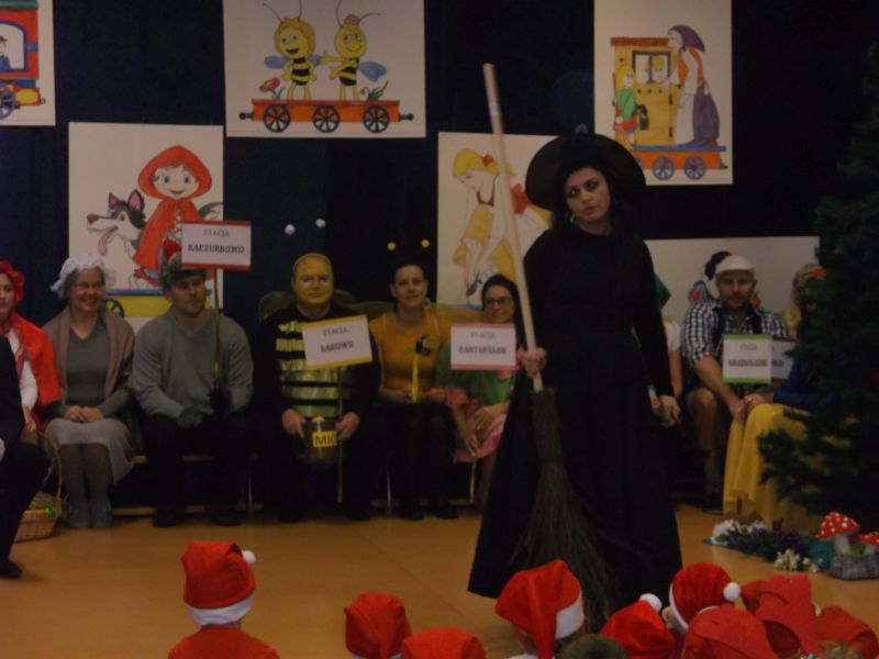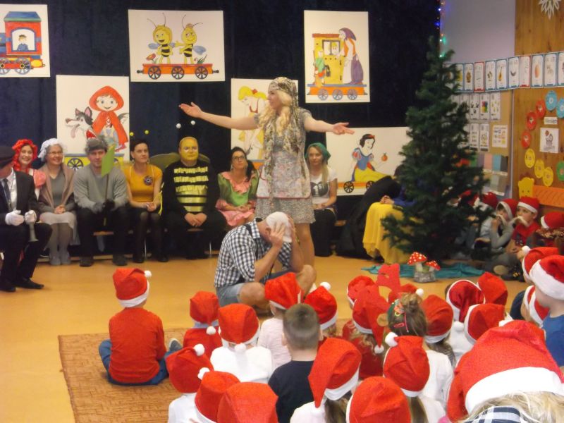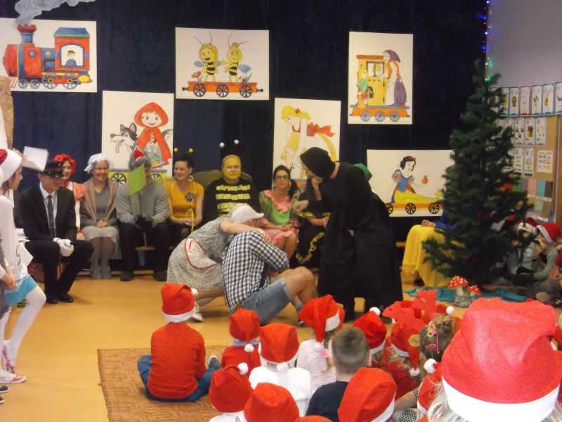 Wśród bohaterów nie zabrakło Czerwonego Kapturka z wilkiem, Pszczółki Mai z Guciem, Jasia i Małgosi, Kopciuszka z siostrami, Królewny Śnieżki i siedmiu krasnoludków oraz maszynisty prowadzącego pociąg. W rolę aktorów wcielili się rodzice oraz dzieci z najstarszej grupy „Wesołej Gromadki". Gośćmi specjalnymi byli prezydent Tomasz Budasz, wiceprezydent Michał Powałowski oraz Ludomira Nawrocka - kustosz filii Biblioteki Publicznej. Po przedstawieniu przybył oczekiwany gość: Mikołaj. Dla każdej grupy Mikołaj przyniósł niespodzianki w postaci zabawek, gier, układanek, odwiedził każdą grupę rozmawiając z dziećmi.