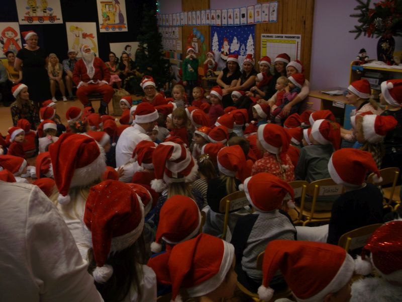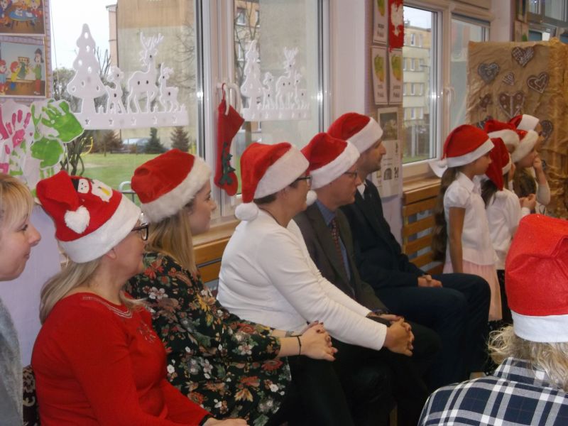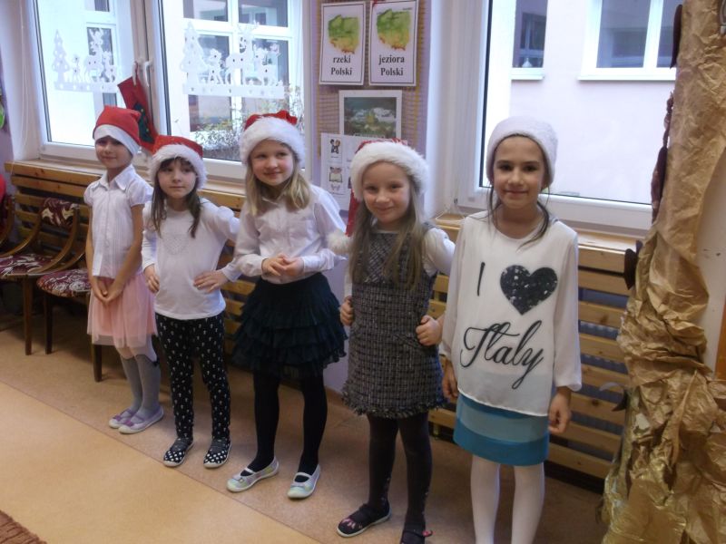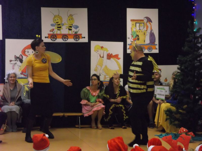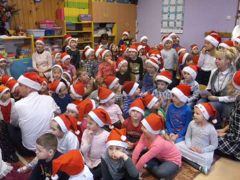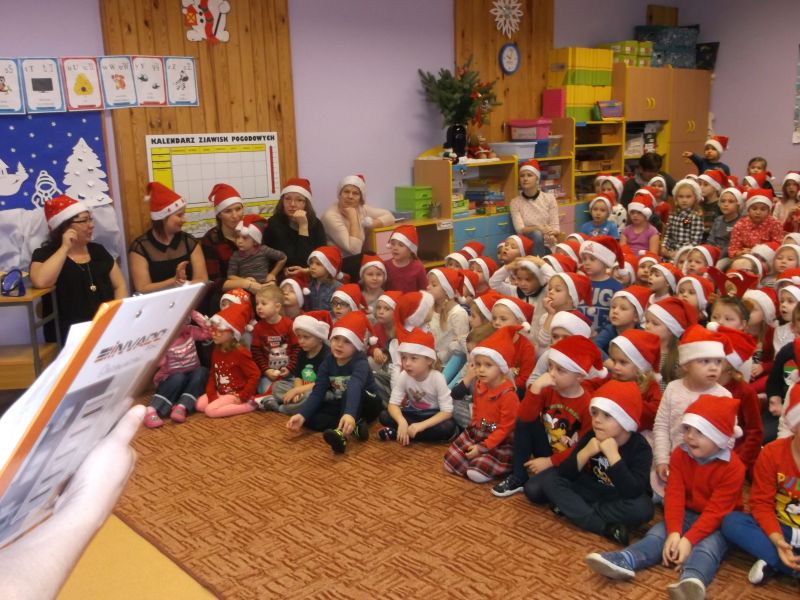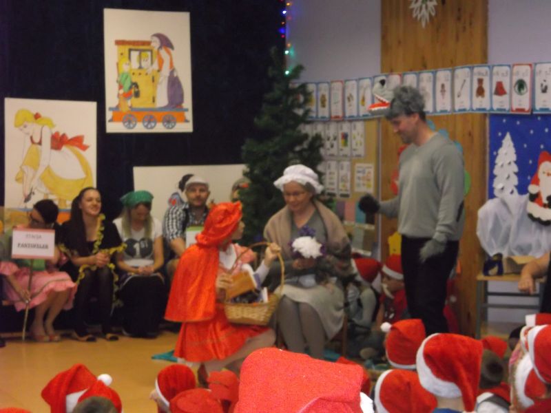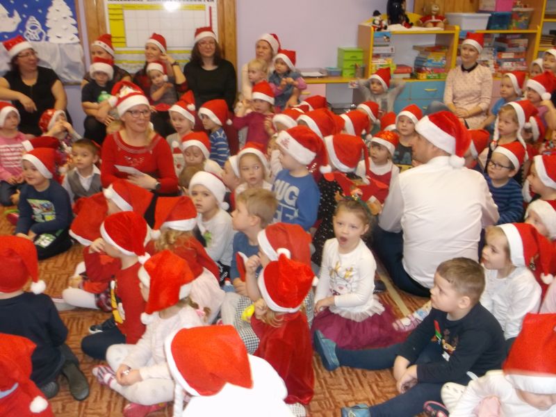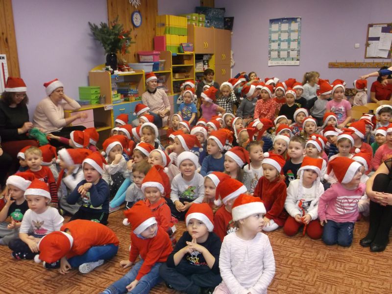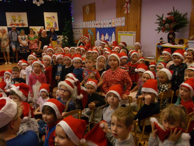 Wśród bohaterów nie zabrakło Czerwonego Kapturka z wilkiem, Pszczółki Mai z Guciem, Jasia i Małgosi, Kopciuszka z siostrami, Królewny Śnieżki i siedmiu krasnoludków oraz maszynisty prowadzącego pociąg. W rolę aktorów wcielili się rodzice oraz dzieci z najstarszej grupy „Wesołej Gromadki". Gośćmi specjalnymi byli prezydent Tomasz Budasz, wiceprezydent Michał Powałowski oraz Ludomira Nawrocka - kustosz filii Biblioteki Publicznej. Po przedstawieniu przybył oczekiwany gość: Mikołaj. Dla każdej grupy Mikołaj przyniósł niespodzianki w postaci zabawek, gier, układanek, odwiedził każdą grupę rozmawiając z dziećmi.