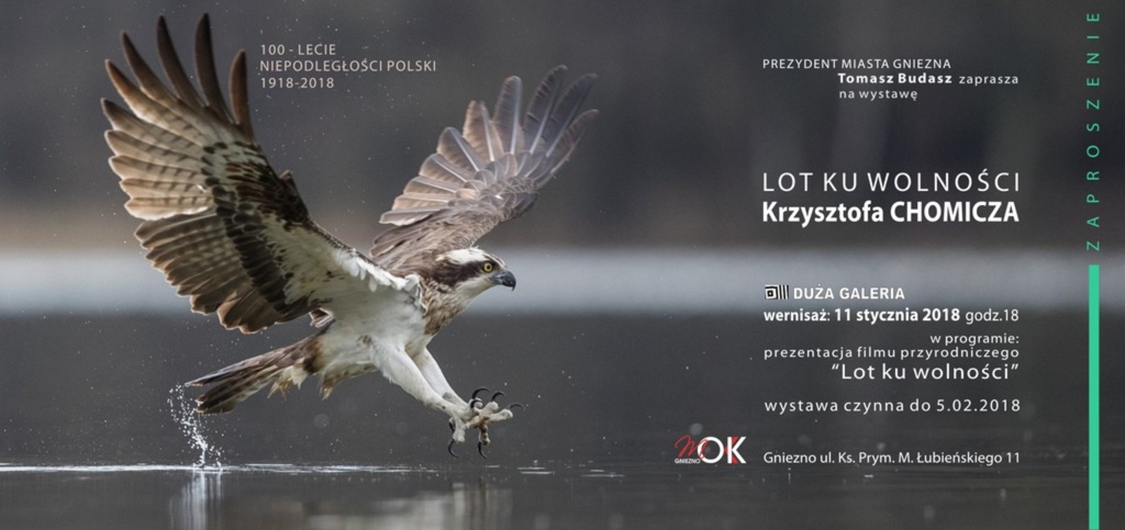 Z okazji 100. Rocznicy Niepodległości Polski zobaczymy także kilkanaście zdjęć poświęconych orłom i bielikowi oraz film "Lot ku wolności". Wernisaż wystawy: 11 stycznia 2018, 18.00.