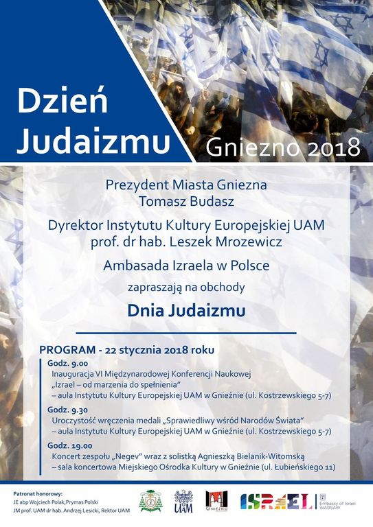 Głównym punktem Dnia Judaizmu będzie konferencja, która odbędzie się między 22 a 23 stycznia 2018 w Instytucie Kultury Europejskiej UAM w Gnieźnie. Konferencja będzie poświęcona wieloaspektowym zagadnieniom związanym z powstaniem, istnieniem i rozwojem państwa Izrael. Szczególną okazją do podjęcia refleksji nad proponowanym tematem jest 70. rocznica powołania do życia państwa żydowskiego. Z wielką radością organizatorzy powitają uczonych zajmujących się historią, socjologią, kulturą, sztuką, religią, filozofią, edukacją, politologią, a także wszystkich innych, którzy prowadzą badania związane z proponowaną problematyką.