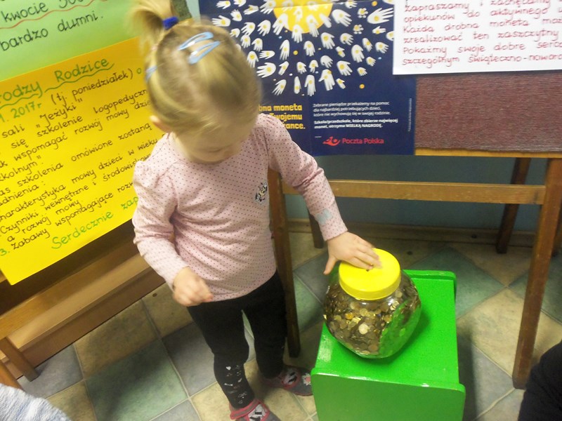 W akcję zaangażowała się cała społeczność przedszkolna: dzieci, rodzice, dziadkowie oraz sympatycy placówki. Udało się zebrać 349,69 złotych. Pozyskano 32,165kg monet.
