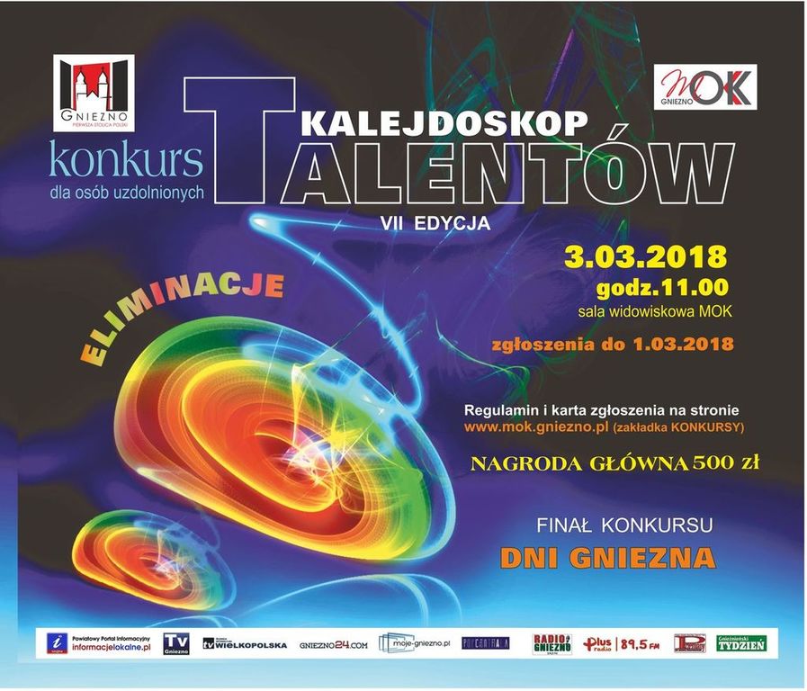 - Zgłoszenia do eliminacji przyjmowane będą na karcie uczestnictwa dostarczonej do MOK: osobiście na adres: Ul. Łubieńskiego 11, 62-200 Gniezno, oddanej w informacji w godzinach od 7.00 do 20.00, w soboty i niedziele od 9.00 do 17.00; wysłanej pocztą tradycyjną lub mailową na adres: sekretariat@mok.gniezno.pl w tytule „Kalejdoskop Talentów” do 1.03.2018.