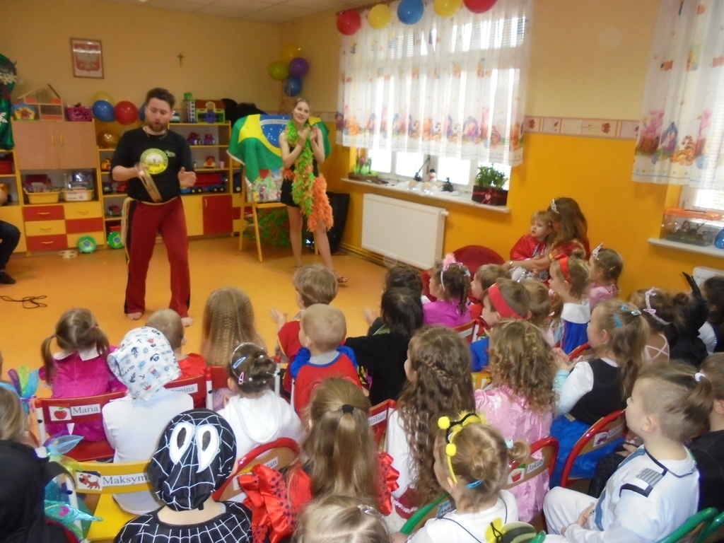 Druga faza balu to warsztatowe spotkanie muzyczno-taneczne Kulturka „Walczymy i tańczymy” podczas którego dzieci poznały tajniki capoeiry i kroki samby. Gorący brazylijski folklor, z którym nierozłącznie splecione są instrumenty perkusyjne, muzyka i taniec idealnie wkomponował się w karnawałowy przedszkolny bal. Nic więc dziwnego, że występujący artyści otrzymali gromkie owacje.