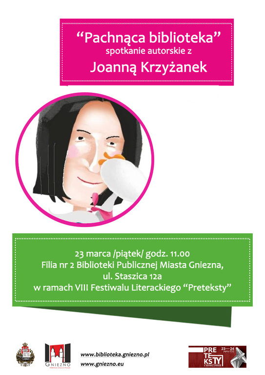 Spotkanie autorskie dla dzieci z Joanną Krzyżanek odbędzie się 23 marca /piątek/ o 11.00 w Filii nr 2 Biblioteki Publicznej Miasta Gniezna przy ul. Staszica 12a w ramach VIII Festiwalu Literackiego „Preteksty”, w celu promocji wartościowej literatury dziecięcej.