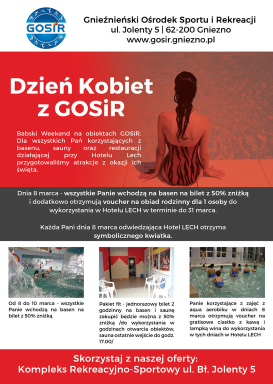 Gnieźnieński Ośrodek Sportu i Rekreacji zaprasza wszystkie Panie na Babski Weekend odbywający się na naszych obiektach. Dla Pań korzystających z basenu, sauny oraz restauracji działającej przy Hotelu Lech przygotowano szereg atrakcji. Szczegóły na plakacie. Zapraszamy!
