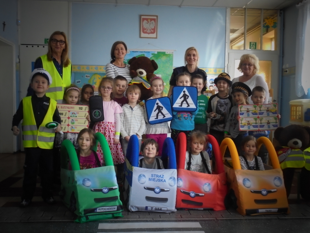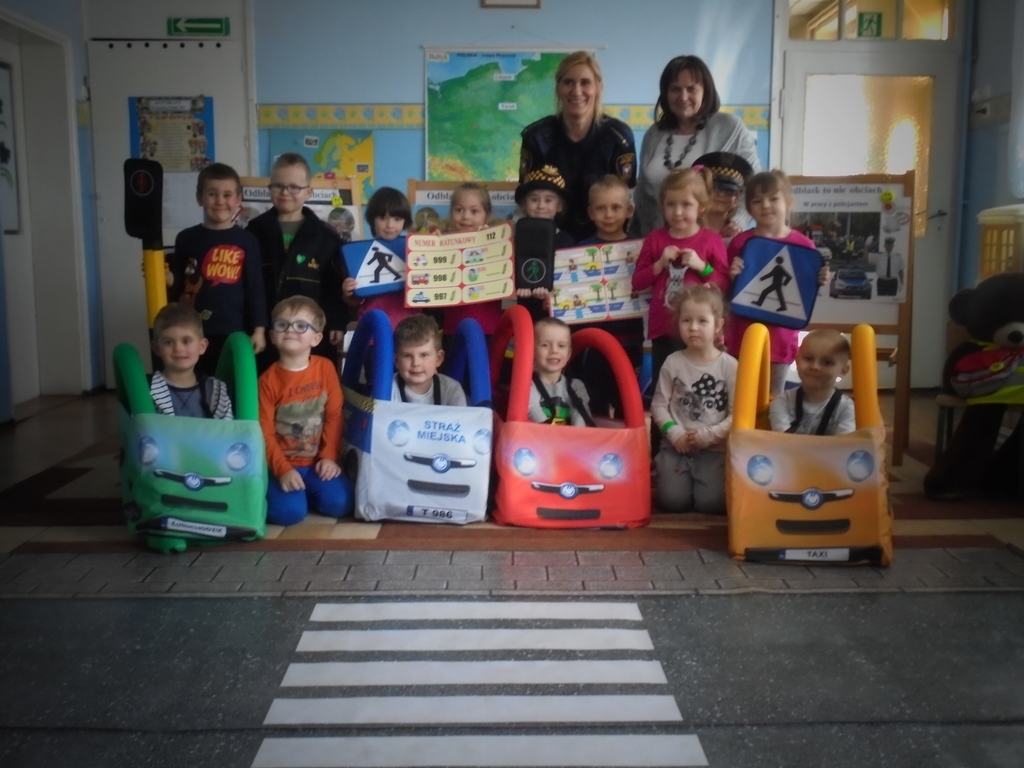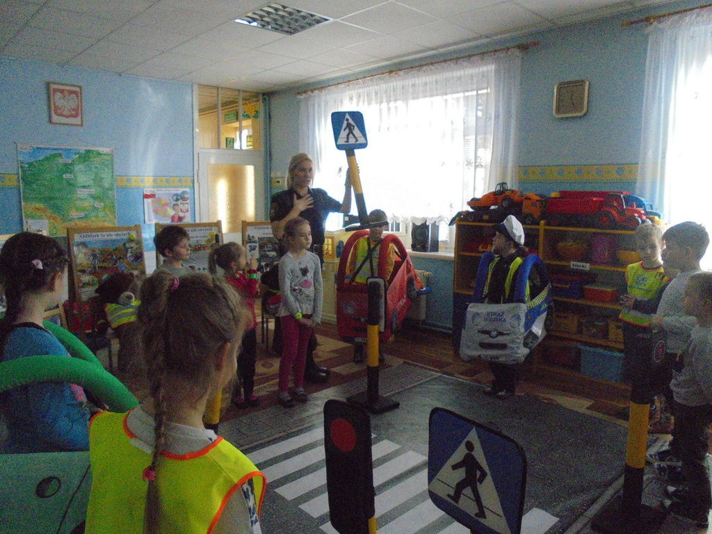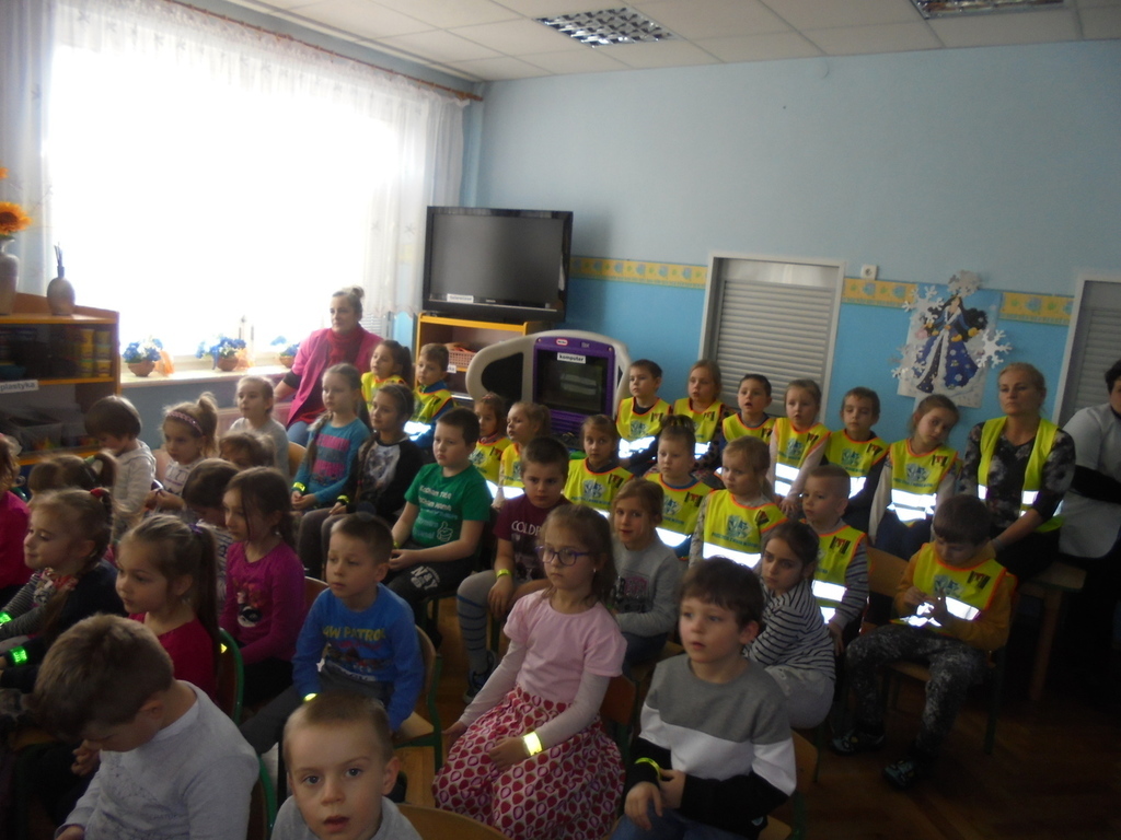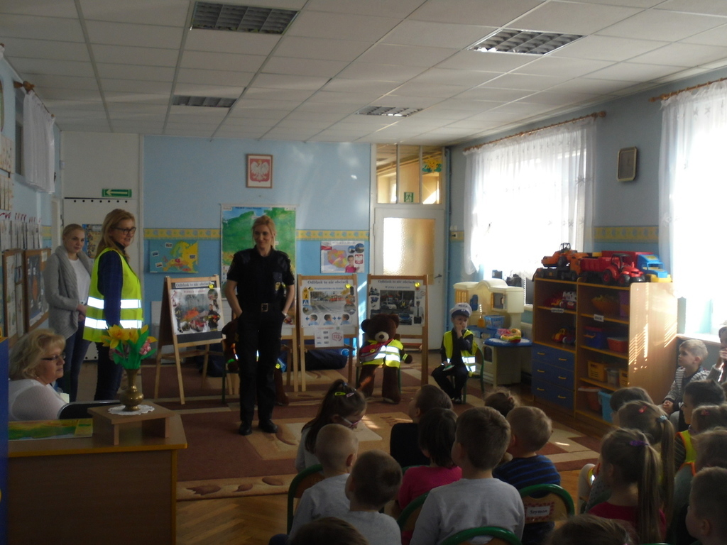 Spotkanie miało miejsce w sali „Bławatki” odpowiednio do tego przygotowanej. Oprócz obrazów nawiązujących do bezpiecznego poruszania się w ruchu ulicznym i planszy z numerami alarmowymi, w sali gościły dwa pluszowe misie, które wyposażone były w różnego rodzaju odblaskowe elementy stroju, jakie obowiązują przedszkolaków z naszego przedszkola w czasie wyjść poza placówkę: kamizelki odblaskowe, opaski, ruchome odznaki przypinane do kurtek lub plecaków.
