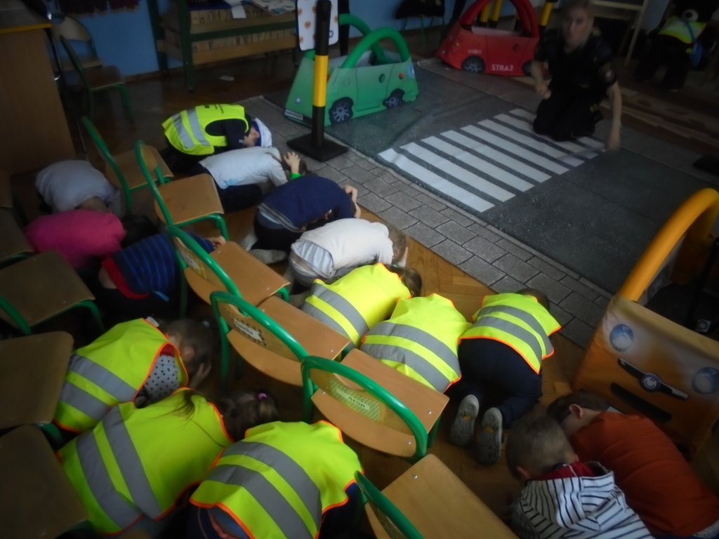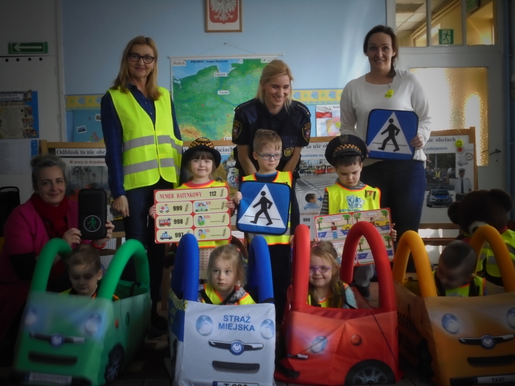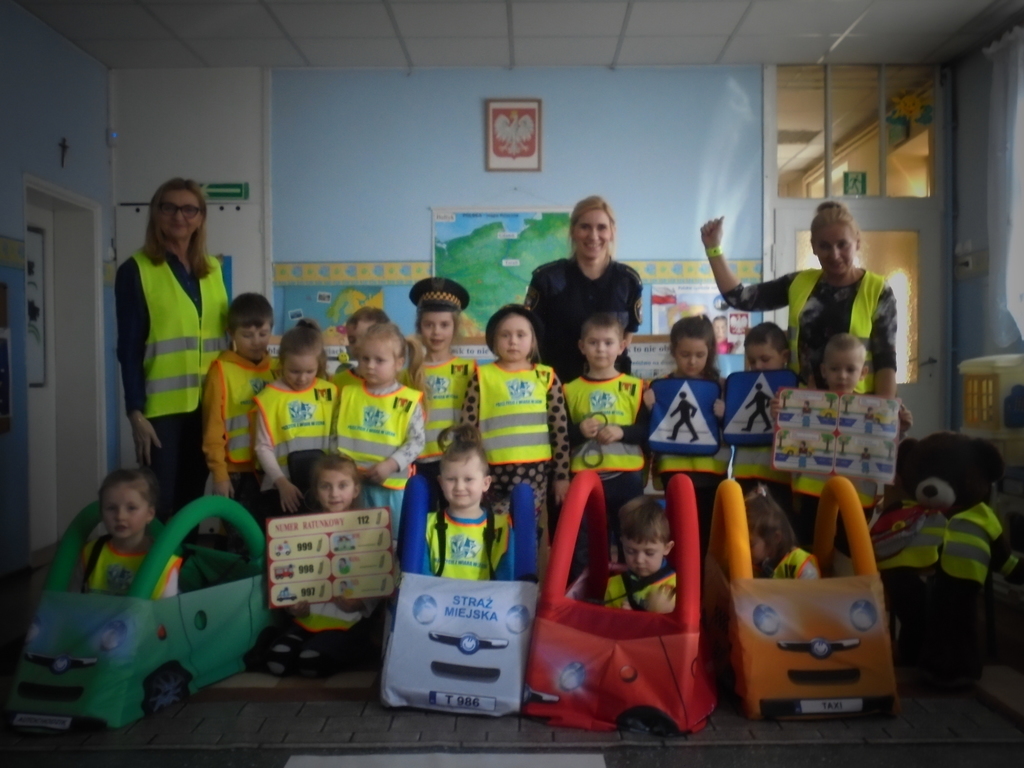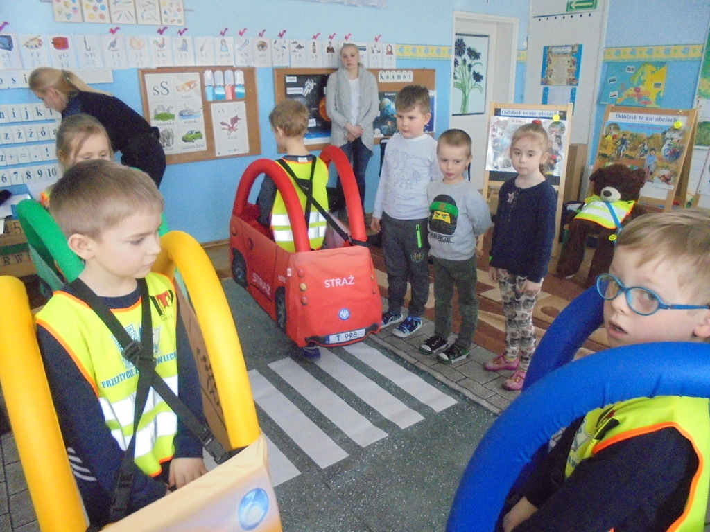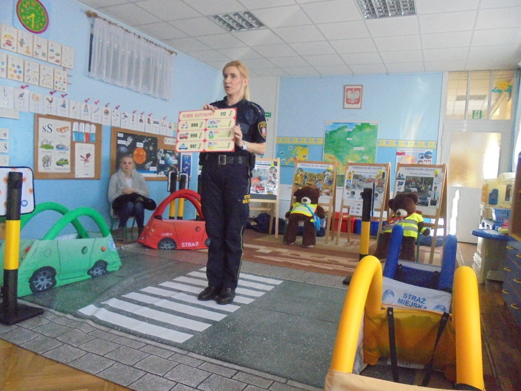 Spotkanie miało miejsce w sali „Bławatki” odpowiednio do tego przygotowanej. Oprócz obrazów nawiązujących do bezpiecznego poruszania się w ruchu ulicznym i planszy z numerami alarmowymi, w sali gościły dwa pluszowe misie, które wyposażone były w różnego rodzaju odblaskowe elementy stroju, jakie obowiązują przedszkolaków z naszego przedszkola w czasie wyjść poza placówkę: kamizelki odblaskowe, opaski, ruchome odznaki przypinane do kurtek lub plecaków.