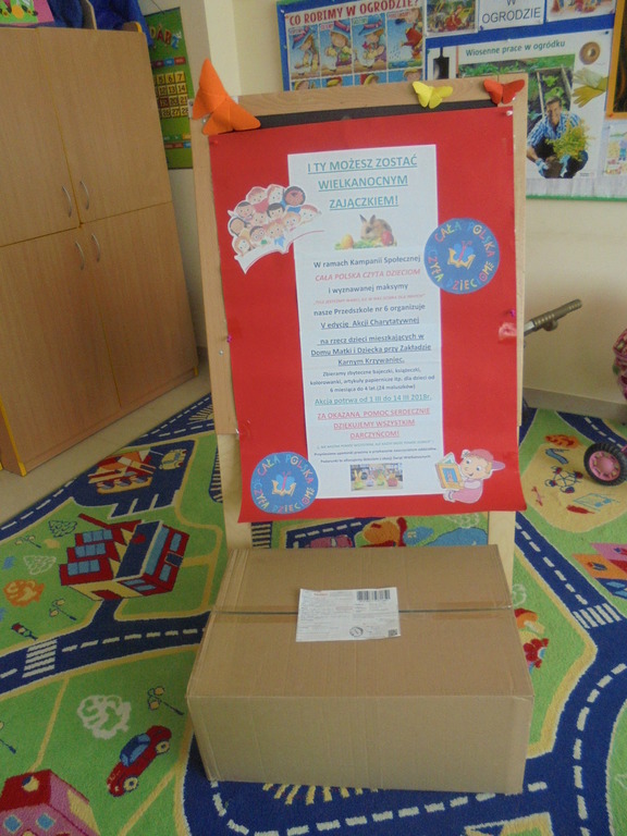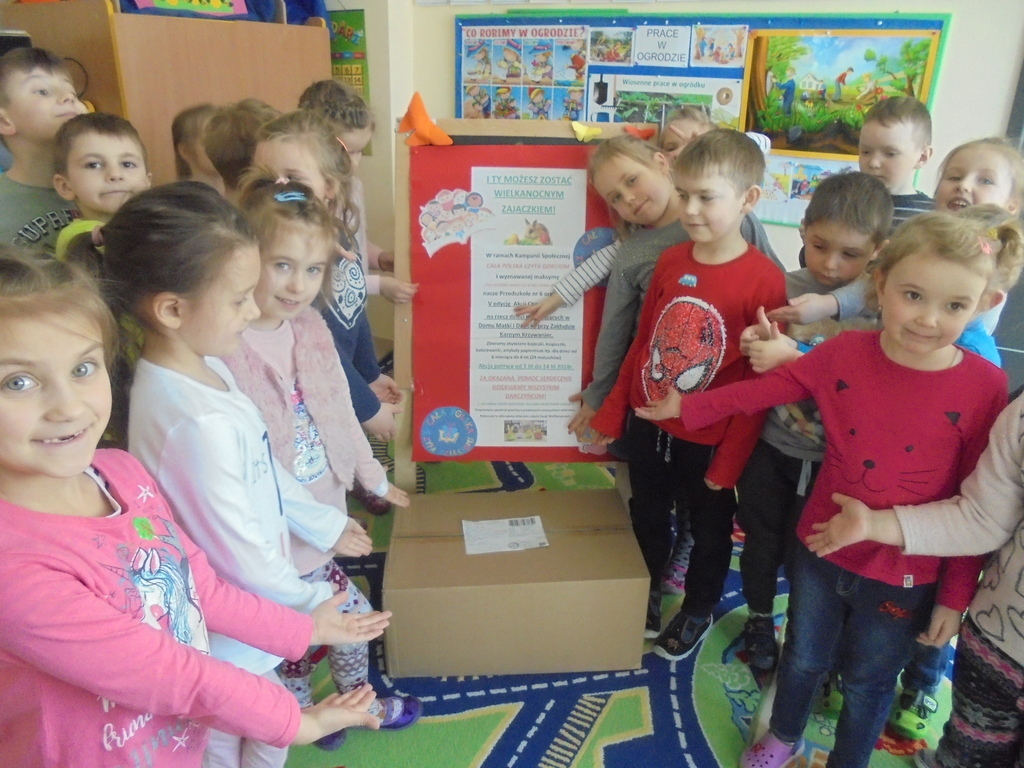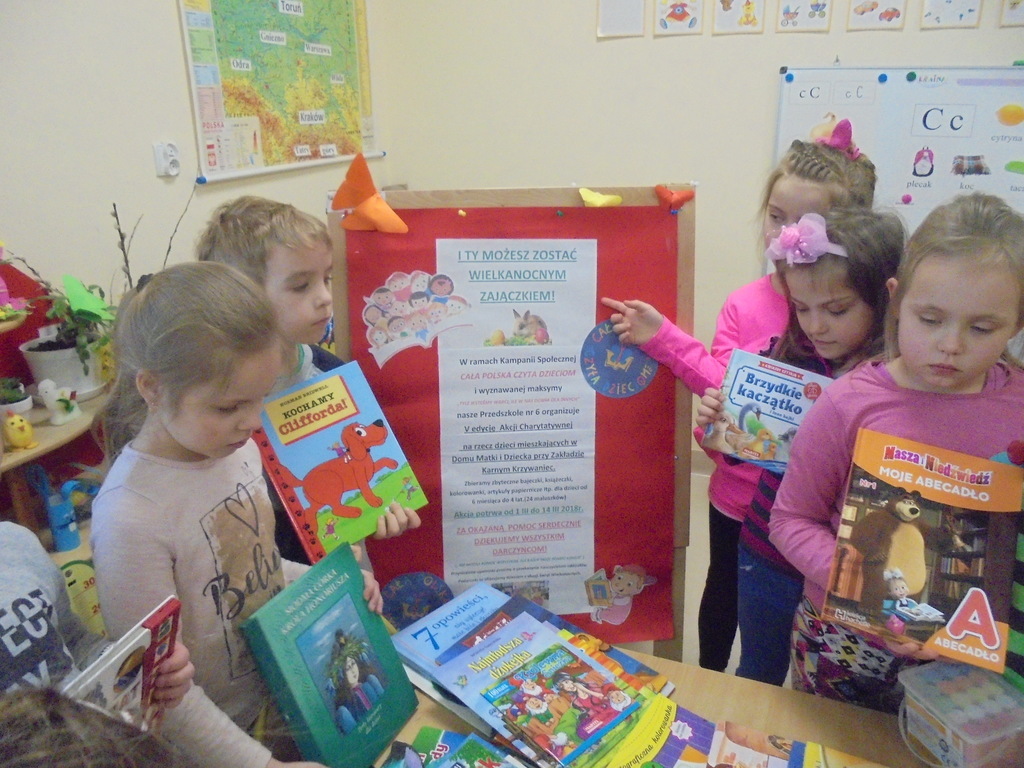 Obecnie mieszka tam 24 maluszków w wieku od 6 miesięcy do 4 lat. Zebrane dary wraz z wielkanocnymi życzeniami pojechały do dzieciaków. Bardzo serdecznie dziękujemy wszystkim ofiarodawcom! Kolejna edycja tego przedsięwzięcia miała na celu rozwijanie wrażliwości i zachęcanie przedszkolaków do „czynienia dobrych uczynków”. Akcję zorganizowała Anna Bartczak-Polerowicz, przedszkolny koordynator kampanii „Cała Polska czyta dzieciom” w ramach promocji głośnego czytania dzieciom.
