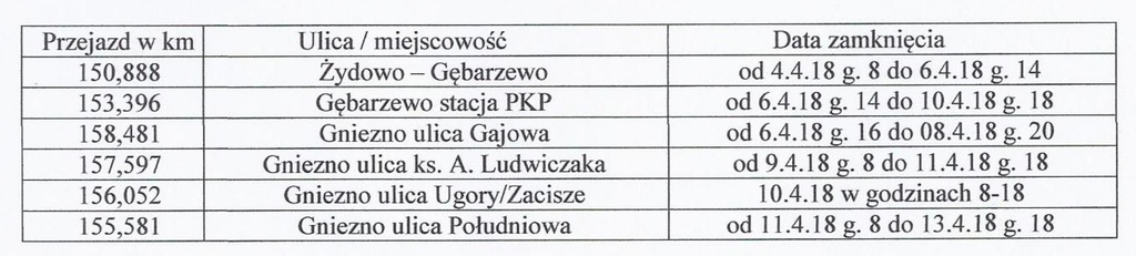 Zamknięcie przejazdów kolejowych na trasie Żydowo – Gniezno