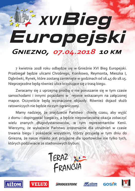 7 kwietnia o godz. 17:00 na gnieźnieńskim Rynku wystartuje XVI edycja Biegu Europejskiego. Impreza cieszy się dużym zainteresowaniem biegaczy. 10-kilometrowy Bieg Europejski to jedna ze sportowych wizytówek Gniezna. Impreza odbywa się od 15 lat i z roku na rok przyciąga coraz więcej uczestników nie tylko z Pierwszej Stolicy Polski, ale praktycznie z całego kraju. Gnieźnieńska „dycha” cieszy się dużą popularnością wśród biegaczy również ze względu termin zawodów, który umożliwia doskonałe przetarcie i sprawdzenie formy przed rozgrywanymi tydzień później kwietniowymi maratonami w Gdańsku i Łodzi, ORLEN Warsaw Marathon oraz półmaratonem poznańskim.