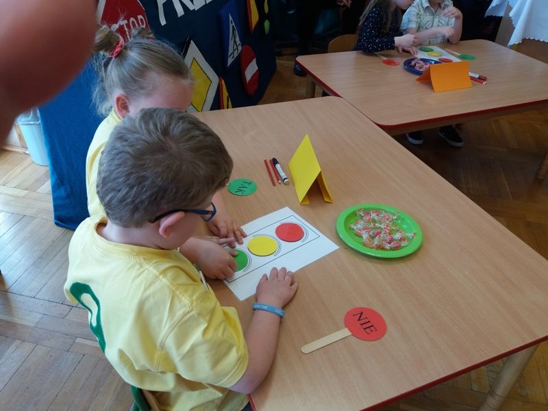 Na dzieci czekały bardzo ciekawe zadania: „Zgaduj zgadula”, zabawa: Tak-Nie”, zrobienie „Przejścia dla pieszych”, układanie kolorów na sygnalizatorze, odnajdywanie i zakreślanie numerów alarmowych. Wszystkie przedszkolaki zrobiły ogromne wrażanie na jury i wykazały się ogromną wiedzą i umiejętnościami. Dlatego też wszyscy uczestnicy konkursu zostali nagrodzeni dyplomami i upominkami ufundowanymi przez Prezydenta Miasta Gniezna.