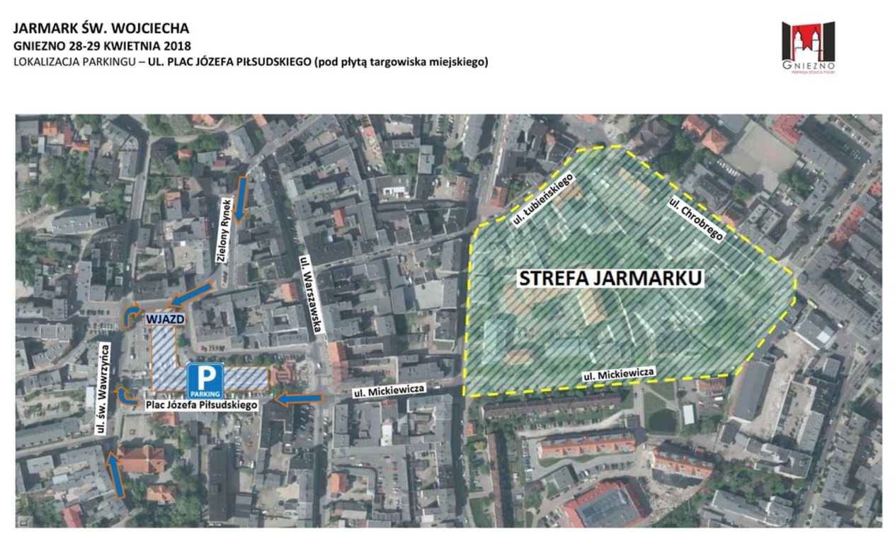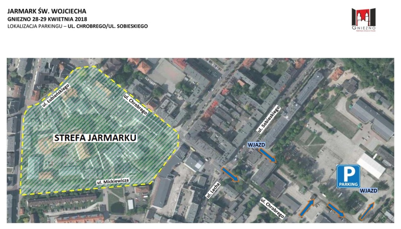 W związku ze zbliżającymi się obchodami ku czci Świętego Wojciecha w Gnieźnie między 28 a 29 kwietnia 2018 roku oraz tradycyjnym Jarmarkiem, który podobnie jak w latach ubiegłych zlokalizowany będzie na ulicach Mickiewicza, Chrobrego i Łubieńskiego, przypominamy zmotoryzowanym mieszkańcom centrum o możliwości bezpłatnego parkowania pojazdów na parkingu przy ul. Sobieskiego (wjazd przy Powiatowym Urzędzie Pracy lub naprzeciw spółki Urbis od ul. Chrobrego).