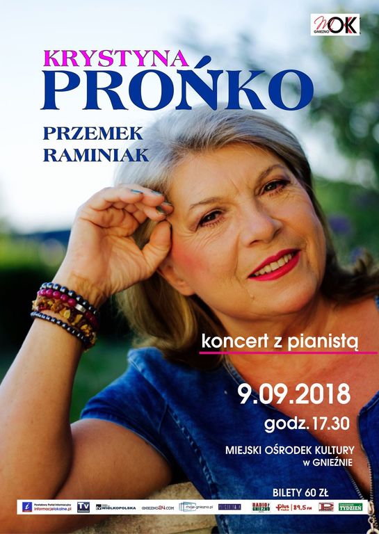 9 września 2018 o godzinie 17.30 zapraszamy serdecznie na koncert Krystyny Prońko, z okazji rozpoczęcia 65. sezonu Miejskiego Ośrodka Kultury w Gnieźnie. Bilety w cenie 60 złotych do nabycia w Miejskim Ośrodku Kultury w Gnieźnie od 17 maja 2018.