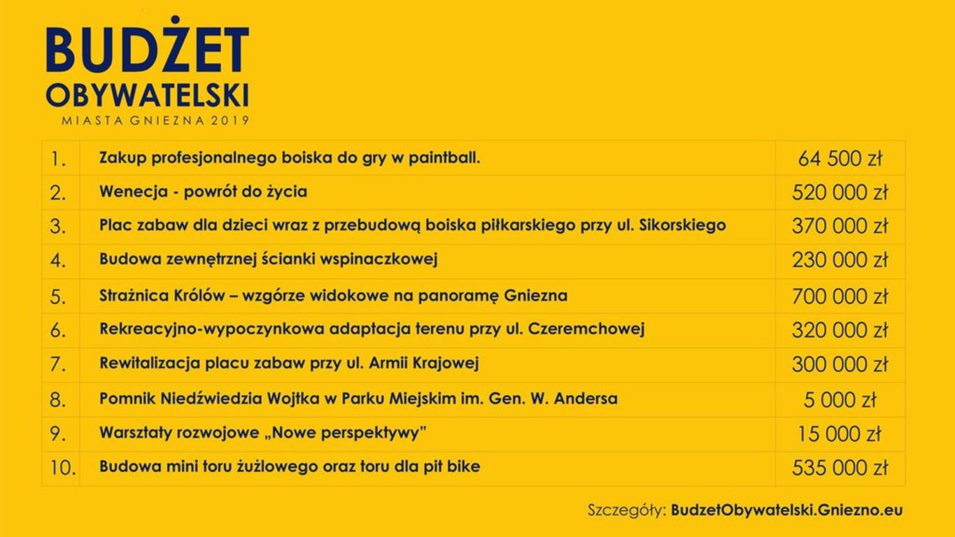Znamy już projekty mieszkańców, które przeszły weryfikację w Urzędzie Miejskim i zostaną poddane pod głosowanie w tegorocznym Budżecie Obywatelskim Miasta Gniezna. To w sumie 10 projektów. Głosowanie rozpocznie się 4 i potrwa do 15 czerwca 2018 roku.