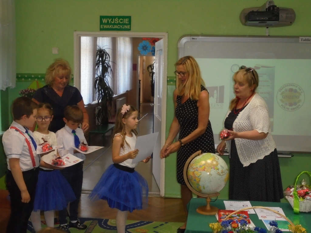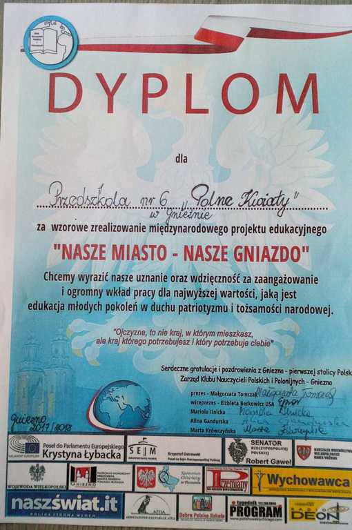 23 maja 2018 roku, w samo południe, w Przedszkolu nr 6 „Polne Kwiaty” w Gnieźnie, w grupie „Bławatki” miała miejsce wyjątkowa uroczystość. W ramach obchodów Dnia Matki oraz podsumowania międzynarodowego projektu „Nasze miasto – nasze gniazdo” zaproszono do udziału niecodziennych gości: dyrektor Wydziału Nadzoru Pedagogicznego Kuratorium Oświaty Aleksandę Kuź; starszego wizytatora Kuratorium Oświaty w Poznaniu Sławę Mrożek; prezes Klubu Nauczycieli Polskich i Polonijnych w Gnieźnie Małgorzatę Tomczak oraz wspaniałe mamy naszych „Bławatków”.