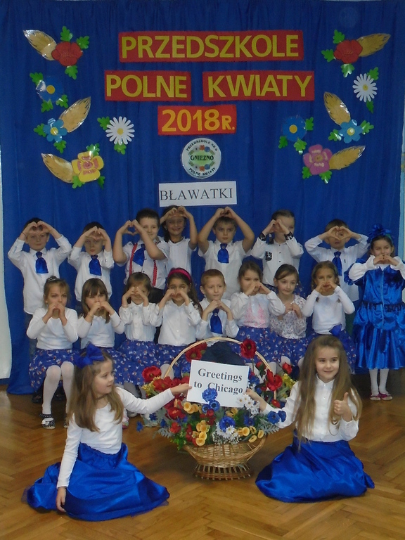 Całość nagrania umieszczono na stronie internetowej przedszkola: www.polnekwiaty.deo.pl, a także wysłano płytkę z nagraniem, folder naszego przedszkola, kalendarzyki „Polnych Kwiatów” oraz zakładki do książek do partnerskiego przedszkola w Chicago.