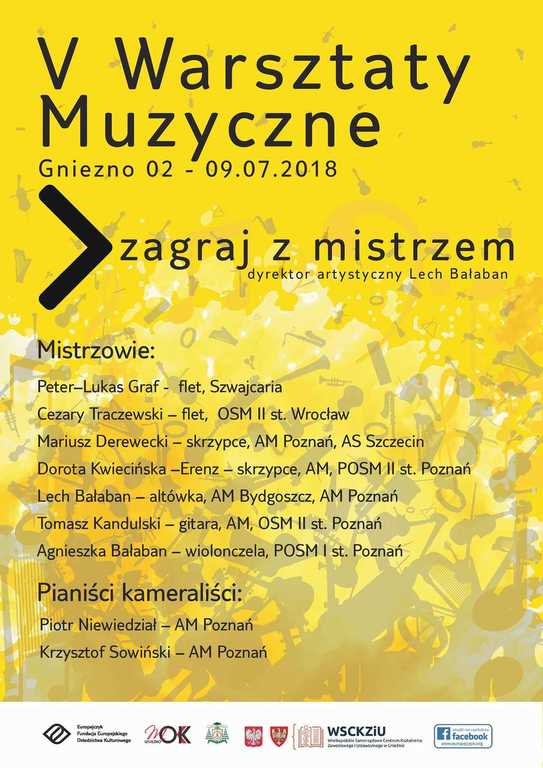 Warsztaty prowadzone są przez grono wybitnych artystów w klasach: skrzypiec, altówki i fletu. Gościem specjalnym w tym roku jest prof. Peter-Lukas Graf ze Szwajcarii, wybitny artysta i ikona metodyki fletowej, uznany na całym świecie. Prof. Grafa będziemy mogli usłyszeć podczas koncertu w Katedrze Gnieźnieńskiej. Koncert finałowy odbędzie się w niedzielę, 8 lipca 2018 w auli Medyka o 19:00. Wszystkie koncerty są otwarte dla publiczności i wstęp jest bezpłatny.