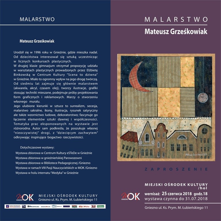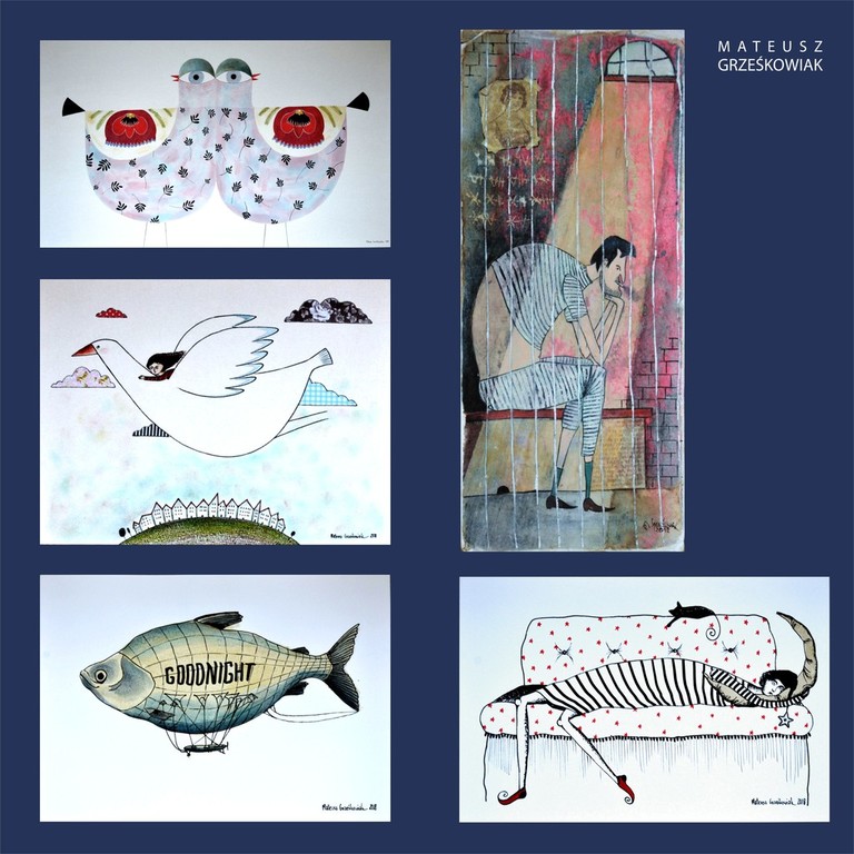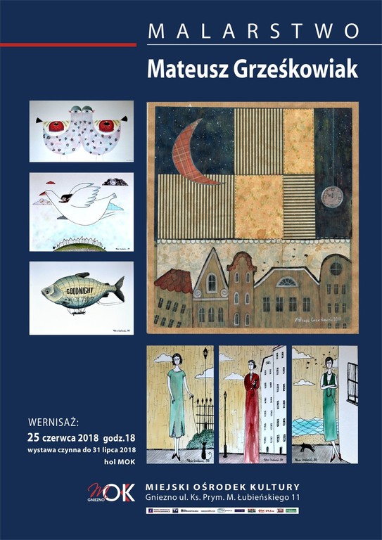 Wystawę malarstwa gnieźnianina Mateusza Grześkowiaka będzie można zobaczyć w poniedziałek, 25 czerwca 2018 roku, o 18.00. Składająca się z niedużych formatów ekspozycja urzeka dekoracyjnością ilustracji oraz grafik, połączeniem elementów sztuki dawnej i współczesnej oraz różnorodnością tematów.