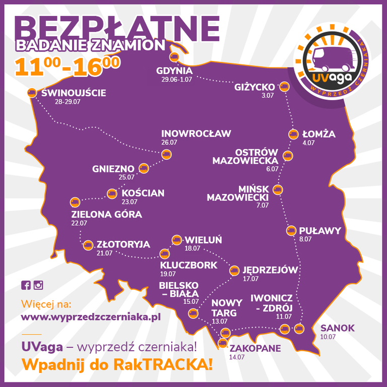 Akcja „UVaga – wyprzedź czerniaka!” rozpoczęła się 29 czerwca br. od bezpłatnych badań w Gdyni. Do tej pory RakTRACK pojawił się w 3 miejscowościach, a z możliwości bezpłatnego przebadania znamion i konsultacji ze specjalistami skorzystało już 805 osób. Szczegółowe informacje na temat inicjatywy oraz trasę mobilnego punktu można znaleźć na stronie akcji: www.wyprzedzczerniaka.pl