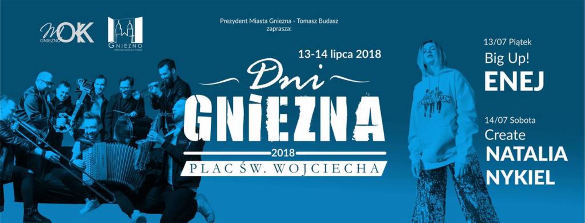 Po ubiegłorocznych propozycjach spod znaku muzyki rockowej (Happysad) i reggae (Mesajah), Dni Gniezna 2018 powracają do muzyki pop – będzie to jednak pop w różnych odsłonach. Pierwszego dnia, zaprezentuje się zespół Enej, szerokimi garściami czerpiący z takich gatunków jak folk i ska. Ich przeboje takie jak „Radio Hello”, „Tak smakuje życie”, czy „Symetryczno-liryczna” zdobywały pierwsze miejsca wielu polskich list przebojów. Natalia Nykiel, prezentująca twórczość z gatunku electro-pop, to z kolei przedstawicielka najmłodszego pokolenia gwiazd, które rozpoczynały swoją karierę w popularnych programach typu talent-show. Mimo zajęcia 4. miejsca w programie „The Voice of Poland”, jako zaledwie 19-latka podpisała kontrakt płytowy z Universal Poland. Jej single „Bądź duży” oraz „Error” zyskały status diamentowych płyt.