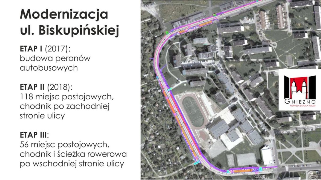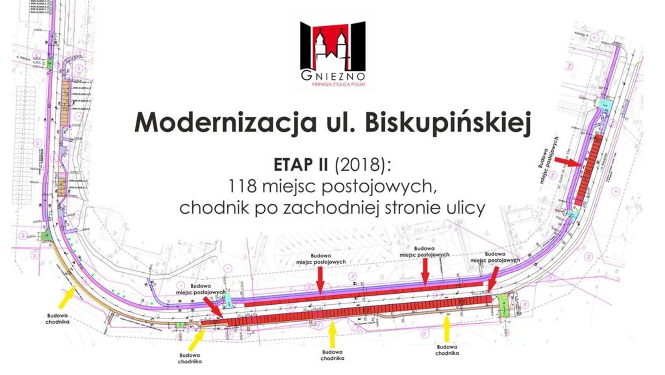- Przy kilku aktualnie prowadzonych przez nas inwestycjach w mieście, np. rewitalizacji Doliny Pojednania czy pracach wokół Wenecji i Łazienek, w miarę możliwości finansowych staramy się etapować prace, konsekwentnie realizując kolejne odcinki. Wszystkiego od razu nie jesteśmy w stanie zrobić, ale praca krok po kroku pozwala nam odmieniać oblicze różnych części miasta – wyjaśnia Prezydent Miasta Gniezna, Tomasz Budasz – Ulicę Biskupińską będziemy realizować w podobny sposób. A właściwie już realizujemy, bo w ubiegłym roku wybudowaliśmy perony autobusowe. Teraz powstaną zatoki na 118 aut przy ogródkach działkowych i przy boiskach SP12 oraz chodnik. W następnym etapie chcemy wybudować kolejne 56 miejsc postojowych przy garażach, dalszą część chodnika oraz nową ścieżkę rowerową – dodaje.