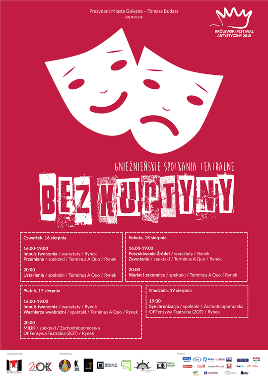 Już czwarta edycja Gnieźnieńskich Spotkań Teatralnych „Bez kurtyny” zgromadzi w Gnieźnie polskie teatry niezależne, które podczas kilku sierpniowych dni (i wieczorów) zaproszą mieszkańców do udziału w warsztatach i akcjach teatralnych. Wydarzenie jest kolejną propozycją z kalendarza Królewskiego Festiwalu Artystycznego 2018.