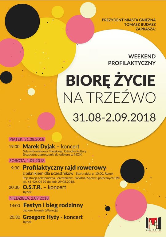 Marek Dyjak będzie muzyczną gwiazdą weekendu profilaktycznego „Nie biorę, nie piję… żyję. Biorę życie na trzeźwo”, poświęconego zapobieganiu uzależnieniom od środków psychoaktywnych jak alkohol, narkotyki, dopalacze oraz przeciwdziałaniu przemocy w rodzinie. Oprócz piątkowego koncertu, w ramach akcji odbędą się festyny i pikniki, a mieszkańcy będą mogli spędzić rodzinnie czas przy dobrej zabawie bez używek.