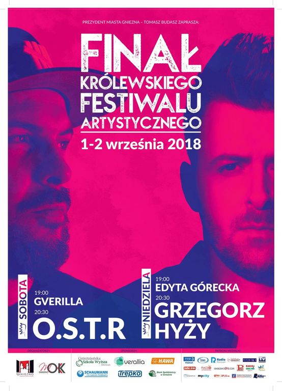 Po 11 weekendach i kilkudziesięciu różnych wydarzeniach artystycznych, Królewski Festiwal Artystyczny tradycyjnie zamknie Koncert Finałowy na gnieźnieńskim Rynku. W tym roku, finał będzie podwójny: 1 września gwiazdą wieczoru będzie łódzki raper O.S.T.R., a dzień później, Ambasador Miasta Gniezna – Grzegorz Hyży.