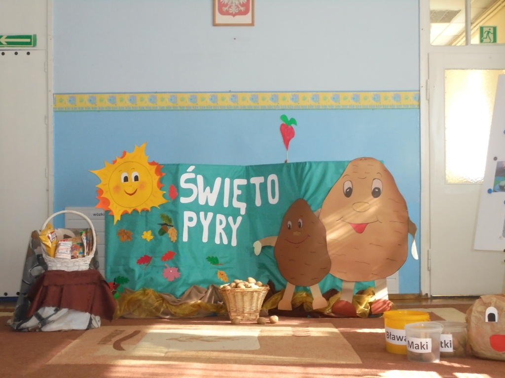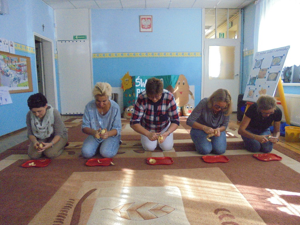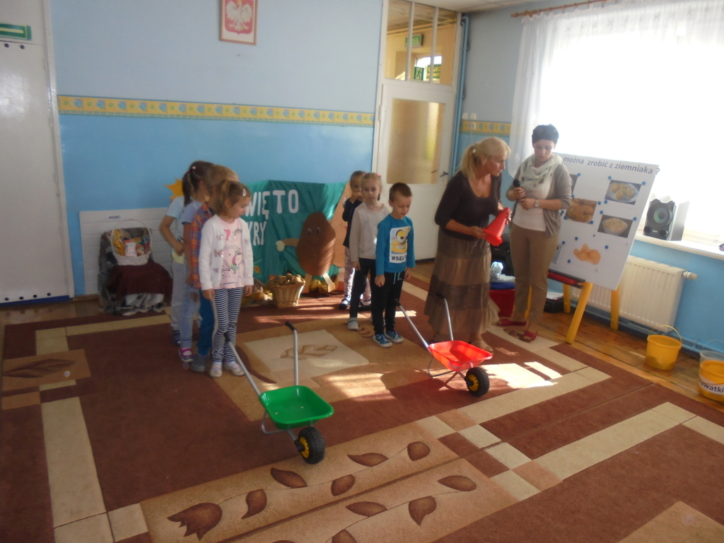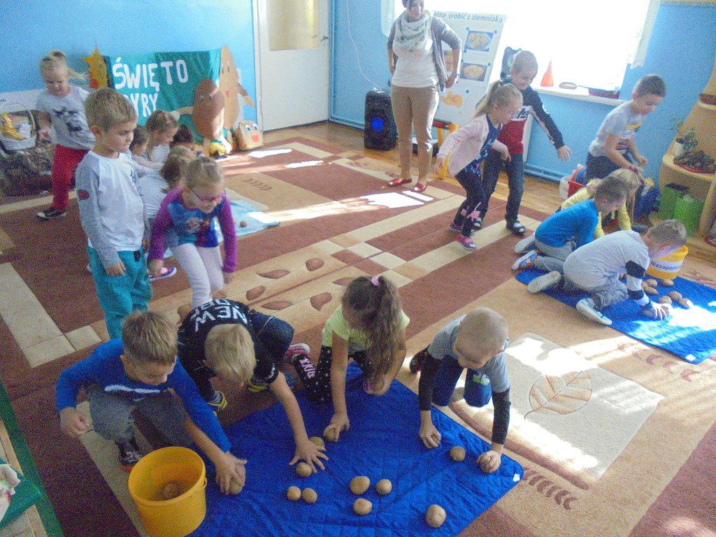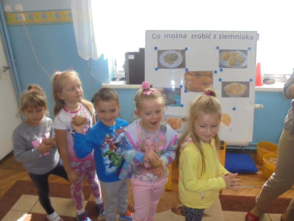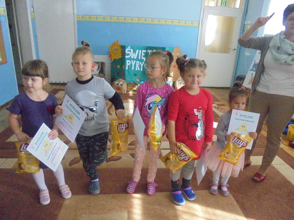 Mimo niesprzyjającej aury za oknem, w przedszkolu temperatura sięgała zenitu. Po krótkim wprowadzeniu przez panie Anię i Iwonę, dzieci odśpiewały piosenkę, której słowa w bardzo wymowny sposób łączyły się z obchodzonym świętem i zapadły w pamięć przedszkolakom: „Ziemniaczki, ziemniaczki dzisiaj dla was mamy…” I tu należą się słowa podziękowania dla pań kucharek, które i tego dnia stanęły na wysokości zadania i przygotowały przepyszne dania z ziemniaka i jego przetworów. Na stole przedszkolaków gościły m.in. kisiel czy też ziemniaczane kopytka. Jednak największą frajdę dzieciom przyniosła niespodzianka przygotowana przez organizatorki w porozumieniu z rodzicami - ziemniaczane chipsy.