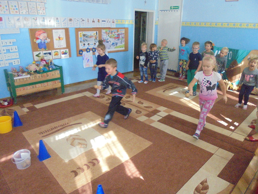 Jednak zanim dzieci otrzymały „nagrodę” obejrzały teatrzyk kukiełkowy, w którym warzywa zgodnie okrzyknęły ziemniaka królem. Jak wiadomo, najlepszą formą przyswajania wiedzy jest nauka przez zabawę. Tak też było u Polnych Kwiatów. Dzieci poznały nazwy warzyw w języku angielskim oraz nauczyły się ziemniaczanej wyliczanki „One potato, two potato…”. Święto Pyry nie mogło obyć się bez konkurencji sportowych, w których przedszkolaki z radością uczestniczyły. Przenoszenie ziemniaków w wiaderku i na łyżce, przewożenie w taczce, zbieranie ziemniaków do koszyczków, to tylko niektóre z zadań, jakie miały do wykonania dzieci. Wszystkie zabawy sprawiły im wiele radości i spowodowały, że uśmiechy nie znikały z dziecięcych twarzy. Nie zabrakło też konkurencji dla pań, które rywalizowały w obieraniu ziemniaka. Bezkonkurencyjna okazała się pani dyrektor, której serdecznie gratulujemy.