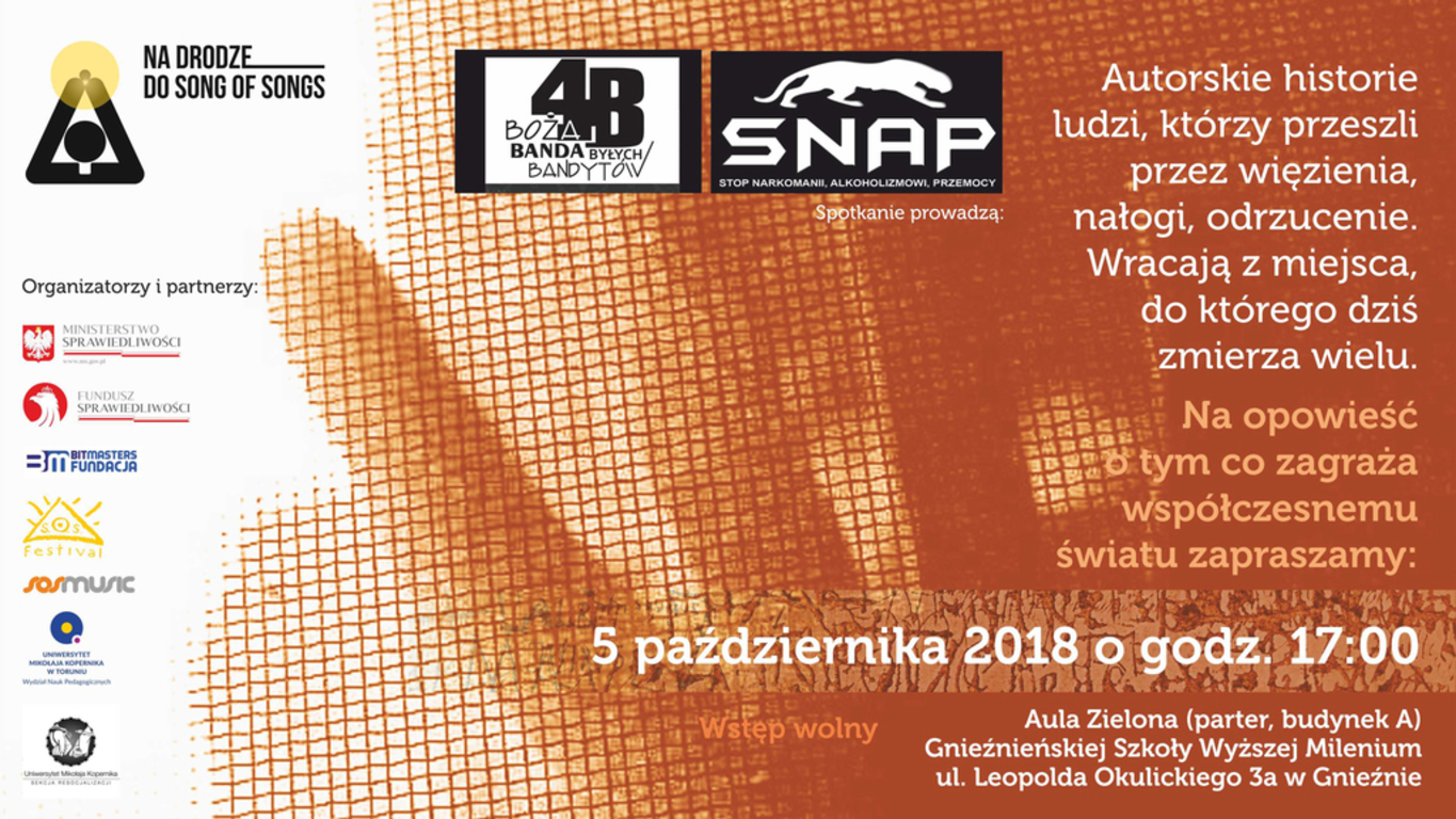 Zapraszamy na spotkanie z grupą 4B - Bożą Bandą Byłych Bandytów. Odbędzie się ono 5.10.2018 roku (piątek) o godzinie 17.00 do Auli Zielonej (Parter, Budynek A) Gnieźnieńskiej Szkoły Wyższej Milenium przy ul. Leopolda Okulickiego 3A w Gnieźnie. Wstęp na wydarzenie jest bezpłatny.