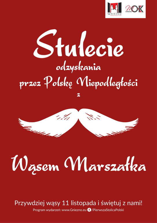 Stulecie z Wąsem Marszałka, ma być właśnie jedną z form, do której zachęcamy. Wystarczy kawałek brystolu, filcu lub innego wybranego materiału, taśma klejąca lub klej, patyczek lub nie i w ciągu 3 minut mamy gotowy atrybut, z którym zapraszamy 11 listopada 2018 o godzinie 11.00 pod Bazylikę Prymasowską, spod której (po zakończonej Mszy św.) wyruszy Kolorowy Pochód dla Niepodległej w na gnieźnieński Rynek.