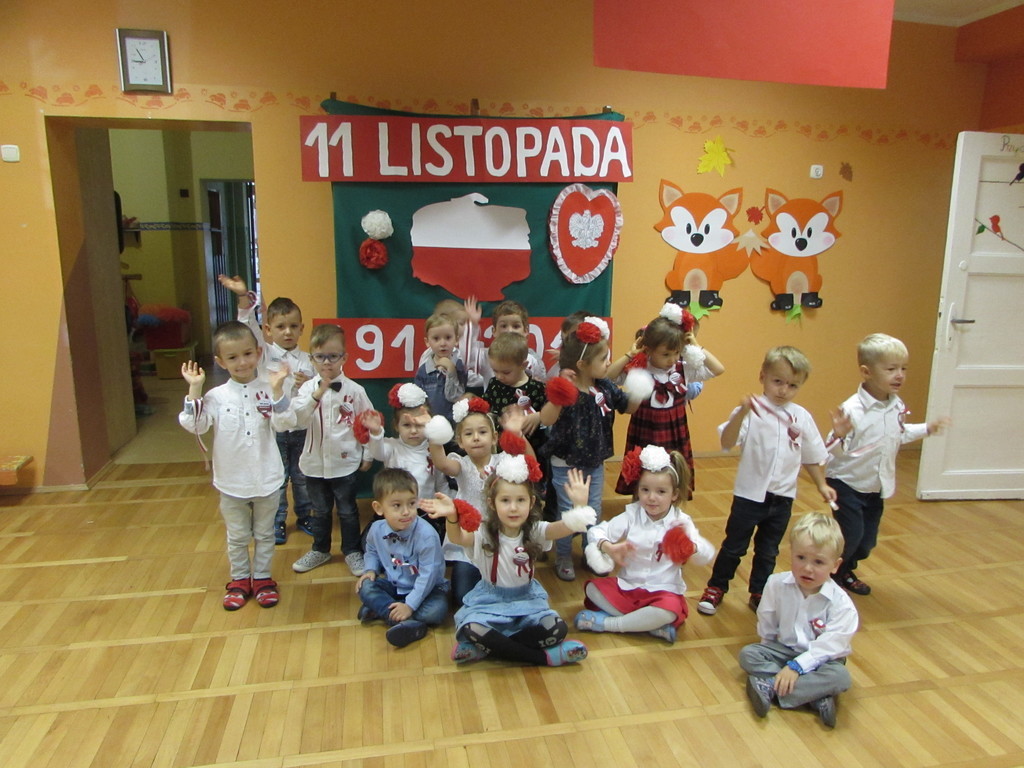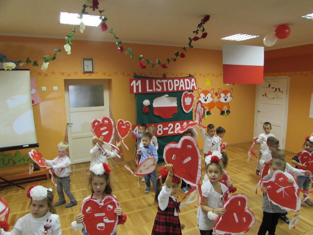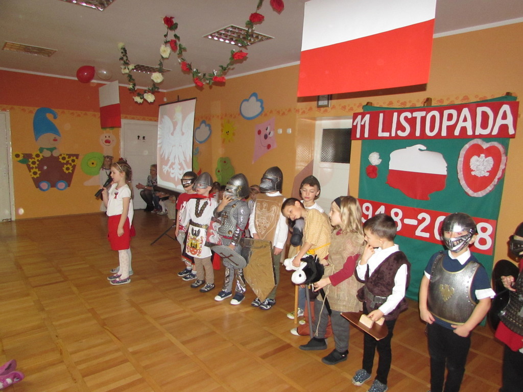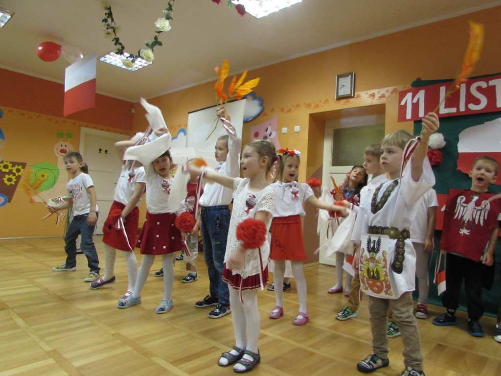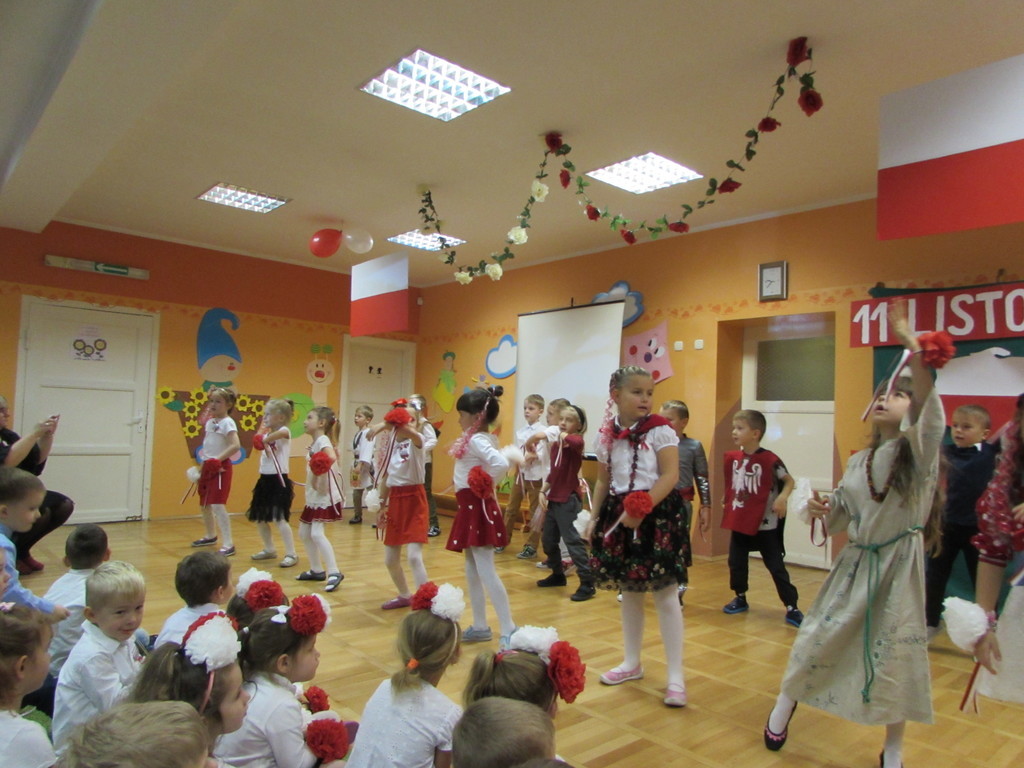 Dzieci z najstarszych grup wiekowych zaprezentowały przed zgromadzonymi gośćmi, w tym prezydentem Michałem Powałowskim oraz radnym Tomaszem Dzionkiem przedstawienie, które treścią nawiązywało do początków państwa Polskiego, jak i trudnej historii odzyskiwania niepodległości. Zwieńczeniem występu był pokaz taneczny. Tu niełatwego zadania podjęły się najmłodsze dzieci, które wykonały wzruszający taniec do piosenki „Serce dla Polski”, a po nich zaprezentowały się starsze dzieci w piosenkach „Ach, jaki piękny kraj” i „Listopadowa Piosenka”. Na koniec zaproszeni goście zagłosowali w konkursie na najlepszą pracę plastyczną ilustrującą Święto Niepodległości.