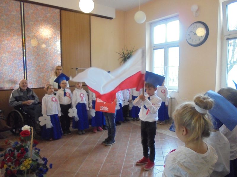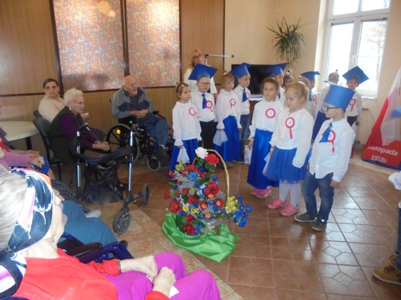 Z tej właśnie okazji 13 listopada 2018 roku dzieci z oddziału IV „Bratki” wraz ze swoimi paniami Barbarą Pisarek i Anną Bartczak -Polerowicz i Iloną Kaczmarek wybrały się do Domu Pomocy Społecznej, by tańcem, wierszami i piosenkami przypomnieć dawne wydarzenia , wspólnie uczcić ten jubileusz i umilić czas jego mieszkańcom. Po krótkim powitaniu głos zabrały przedszkolaki - trochę onieśmielone nową sytuacją-u seniorów były po raz pierwszy- doskonale poradziły sobie z prezentacją swoich talentów i umiejętności recytatorskich, wokalnych i tanecznych. Najpiękniej, jak tylko potrafiły wyśpiewały historię naszego kraju i jego piękno nagradzani co chwilę gromkimi oklaskami. Umiejętności artystyczne dzieci demonstrowane były przez podłączony radiowęzeł, by osoby, które ze względu na swój stan zdrowia nie mogły uczestniczyć w spotkaniu słyszały przeznaczony dla nich koncert. Po występie dzieci wręczyły upominki przygotowane w przedszkolu- kolorowe, papierowe filiżanki z prawdziwą herbatką do wypicia w jesienne wieczory, a seniorzy zrewanżowali się dzieciom słodkościami. Jedna z podopiecznych Domu Pomocy Społecznej w ciepłych słowach serdecznie podziękowała za wiele pięknych chwil, a na twarzach wszystkich było widać ogromne wzruszenie. Następnie był czas na swobodne rozmowy, imienne przedstawienie się dzieci oraz pensjonariuszy domu i wspólne śpiewanie pieśni patriotycznych. Wizyta u seniorów sprzyjała budowaniu dziecięcego systemu wartości- życzliwości, serdeczności, szacunku, zrozumienia i empatii dla choroby ludzkich ułomności.