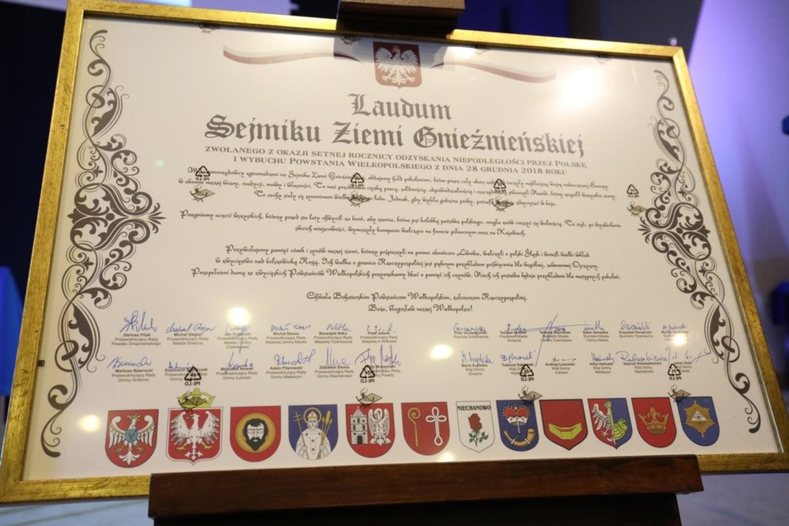 W auli I LO odbył się uroczysty Sejmik Ziemi Gnieźnieńskiej, w którym wzięli udział włodarze oraz radni dziesięciu gmin powiatu gnieźnieńskiego, a także Gminy Powidz oraz radni i władze powiatowe. Najważniejszymi punktami wydarzenia było uroczyste nadanie Szkole Podstawowej nr 7 w Gnieźnie imienia Powstańców Wielkopolskich 1918/1919, a także przyjęcie specjalnego laudum, oddającego cześć bohaterom sprzed stu lat. Odznaczono także osoby zasłużone na rzecz krzewienia pamięci o powstańcach – dokładny spis tych osób i ich życiorysy znajdują się poniżej.