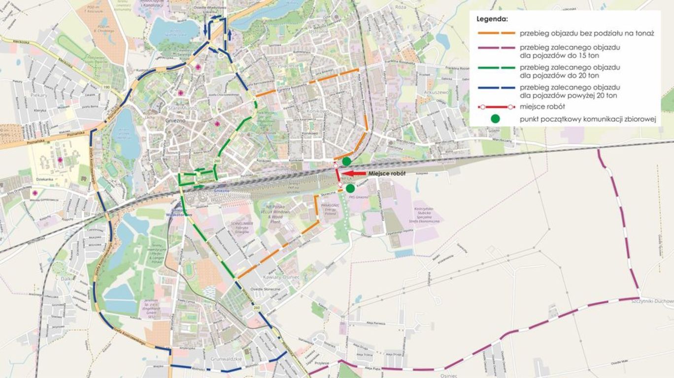 Zamknięcie będzie dotyczyło zarówno ruchu kołowego, jak i pieszego, co jest spowodowane procesem technologicznym jak i względami bezpieczeństwa, związanymi z pracami pod czynnym wiaduktem kolejowym. Zachęcamy mieszkańców, by w miarę możliwości korzystali z komunikacji miejskiej, dzięki czemu ograniczony zostanie ruch samochodowy w tym rejonie miasta. W związku z powyższym MPK Gniezno dokonało koordynacji linii nr 3 z linią nr 5 na przystankach na ul. Dworcowej i Kościuszki tak, aby umożliwić dojazd do zakładów pracy. Uruchomiono także dodatkowy kurs autobusu linii nr 5 o godz. 5:40 z przystanku na ul. Kościuszki.