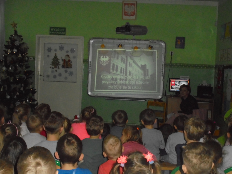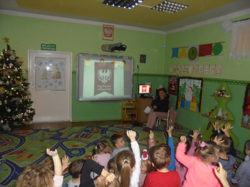 Dzieci miały okazję na tablicy interaktywnej obejrzeć prezentację multimedialną pt. „Piękna nasza Polska cała” przygotowaną przez Iwonę Zarębską-Naplocha i Annę Bartczak-Polerowicz dla upamiętnienia setnej rocznicy Powstania Wielkopolskiego. Dzieci dowiedziały się o zbrojnym wystąpieniu mieszkańców naszej ziemi gnieźnieńskiej przeciwko państwu niemieckiemu oraz formach uczczenia tego tak ważnego zrywu Wielkopolan.