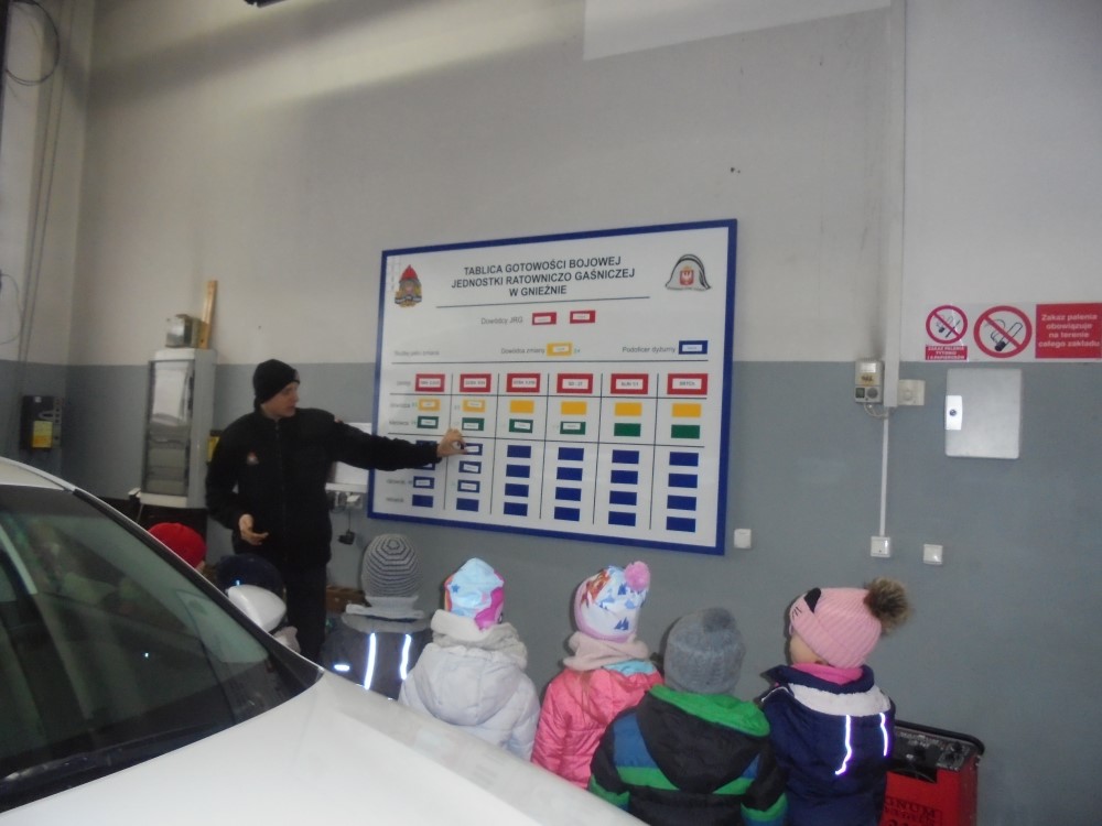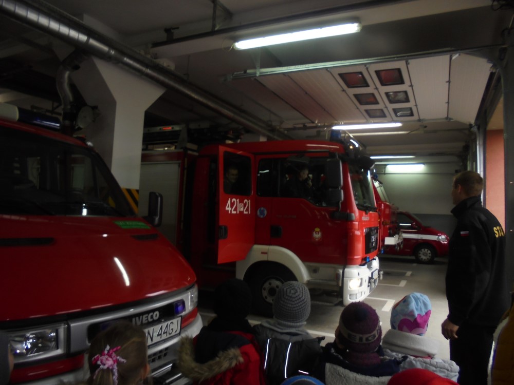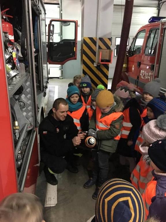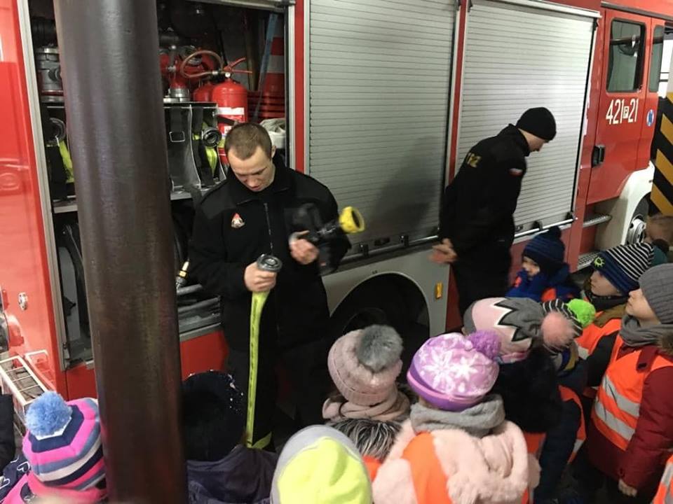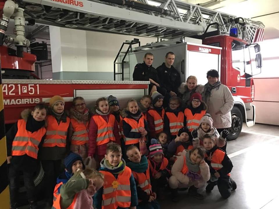 Zimowy, śnieżny poranek, dzieci z grup IV Bratki i V Niezapominajki z Przedszkola nr 6 „Polne Kwiaty” w Gnieźnie z utęsknieniem czekały momentu, gdy panie powiedzą, że to już czas na wyjście. Punktem docelowym była Powiatowa Państwowa Straż Pożarna w Gnieźnie. Po przypomnieniu zasad bezpieczeństwa i właściwego zachowania w autobusie i podczas całej wycieczki, udaliśmy się na miejsce. Tam powitała nas bardzo sympatyczna Pani strażak, zaprowadziła do sali, w której przygotowana była makieta domu. Podczas prezentacji dzieci dowiedziały się, ile niebezpieczeństw może czyhać na nas w domu, na co zarówno my, jak i nasi rodzice, czy osoby dorosłe powinniśmy zwrócić uwagę, aby uniknąć pożaru czy ochronić własne zdrowie i życie. Każdy z nas miał możliwość samodzielnego wskazania niebezpieczeństwa. Zobaczyliśmy do jakich skutków (pożar, utrata przytomności, a nawet życia) może doprowadzić pozostawienie różnych rzeczy w nieodpowiednich miejscach np. zwarcie instalacji, zepsuta mikrofalówka, czy niedopilnowanie gotującego się obiadu. Przedszkolaki podczas warsztatów miały możliwość wykonania symulacyjnego telefonu do Straży Pożarnej i wezwania strażaków do pożaru czy wypadku w domu. Kolejna część wizyty to zejście do garażu. Tam strażacy pokazali wszystkie wozy strażackie, dzieci poznały ich wyposażenie począwszy od węży różnego typu, prądnic, siekier, nożyc, łomów i wielu innych rzeczy, o których często nawet nie miały pojęcia. Dzieci zobaczyły, a nawet przymierzały strój strażaka i dowiedziały się, że od momentu przyjęcia zgłoszenia do wyjazdu wozem strażackim strażacy mają tylko minutę! O czym mogły przekonać się podczas wyjazdu zespołu na prawdziwą „akcję”. Strażacy w tempie ekspresowym założyli stroje i wyjechali na sygnale pozostawiając przedszkolaków z otwartymi z wrażenia buźkami. Na sam koniec pobytu zostaliśmy zaprowadzeni do najważniejszego miejsca w całej strażnicy – do dyspozytorni, gdzie przyjmowane są zgłoszenia wypadków/pożarów i sytuacji trudnych.