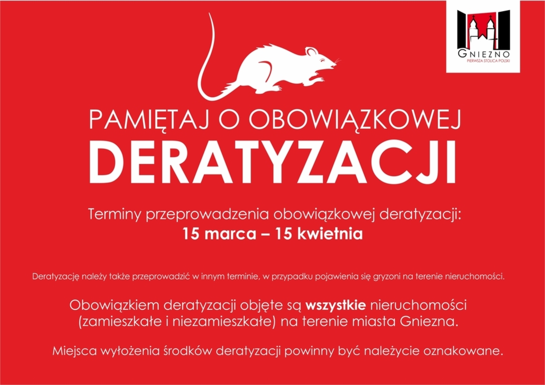 Urząd Miejski w Gnieźnie przypomina o obowiązkowej, corocznej deratyzacji. Obowiązek ten spoczywa na właścicielach nieruchomości, użytkownikach wieczystych, jednostkach organizacyjnych i osobach posiadających nieruchomości w zarządzie lub użytkowaniu i innych podmiotach władających nieruchomościami na terenie miasta Gniezna.