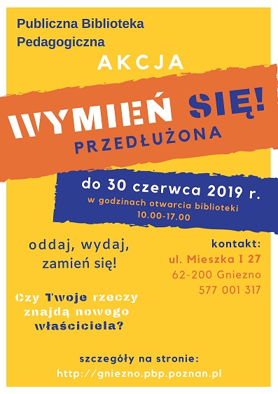Publiczna Biblioteka Pedagogiczna zoorganizowała akcję „Wymień Się!”, która pierwotnie miała trwać od 18 do 30 marca br. Jednak organizatorzy akcji, z uwagi na duże zainteresowanie, przedłużyli czas trwania akcji do 30 czerwca 2019 roku.