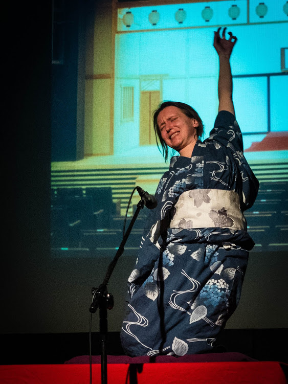 Zaraz po kulturalnym spacerze odbył się w MOK niezwykły pokaz jednoosobowego teatru japońskiego przygotowany przez Anitę Jakubik (pseudonim Kumo) z grupy Kobito Rakugo. Artystka przybyła do Gniezna na zaproszenie Klubu Fantastyki Fantasmagoria. Organizatorzy wydarzenia wyszli z założenia, że literatura nie musi być pisana. Rakugo to opowieści, czyli także literatura, tylko że mówiona. Prezentuje się ją na siedząco, a aktor wciela się w kreowane przez siebie postacie jedynie za pomocą mowy ciała, a także zmiany głosu i kierunku mówienia. Do dyspozycji ma tylko dwa rekwizyty: wachlarz (sensu) i niewielki ręcznik (tenegui). Z tego wszystkiego jest w stanie wyczarować żartobliwe, wesołe, wzruszające, a niekiedy nawet dramatyczne historie. Sztuka ta wymaga wielkich umiejętności w odtwarzaniu różnych bohaterów za pomocą minimalnych środków wyrazu.