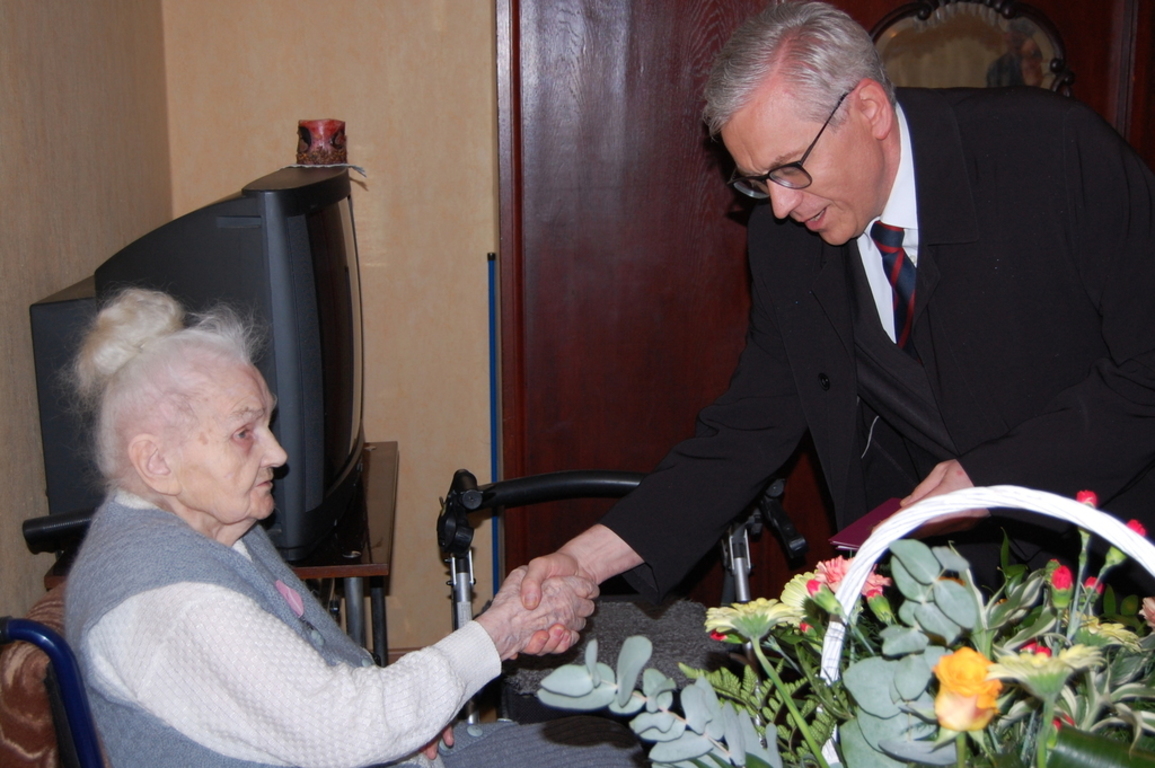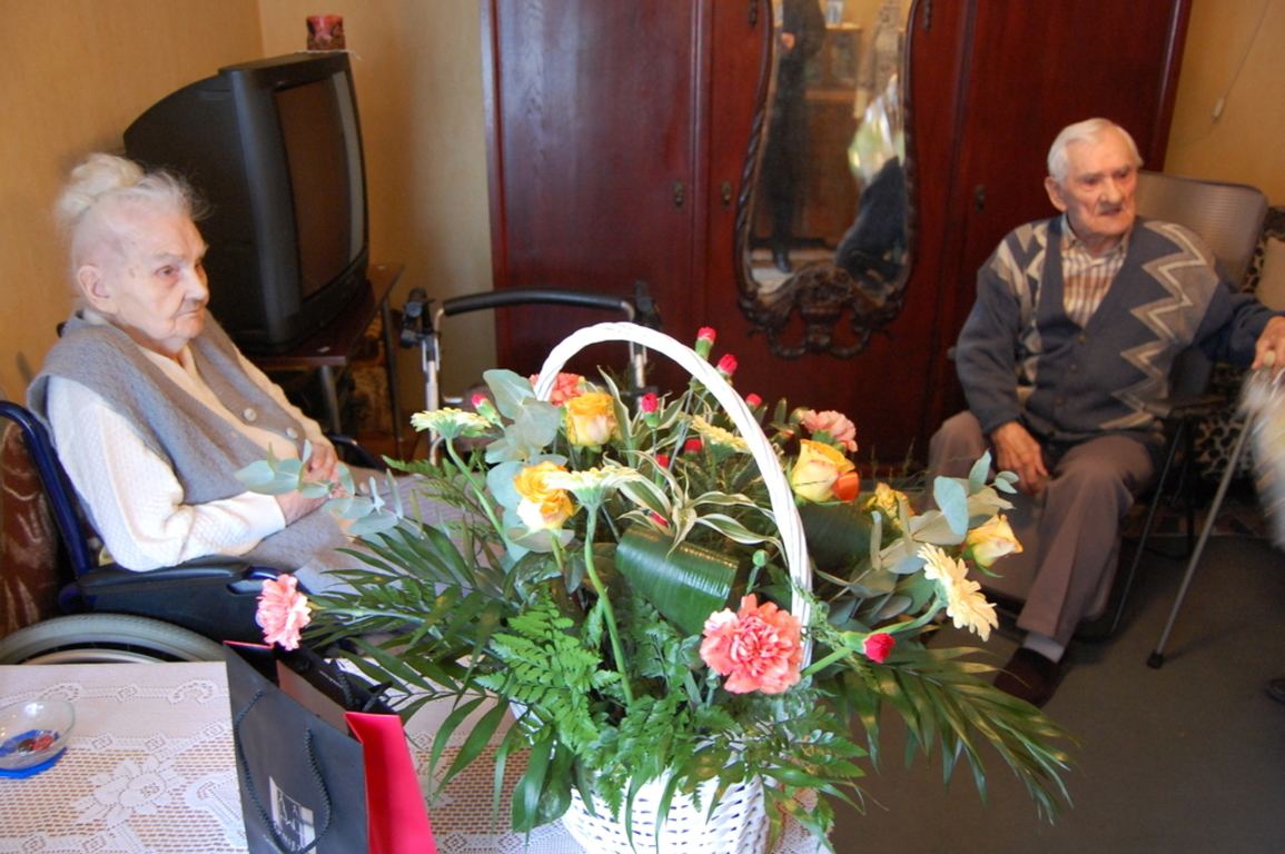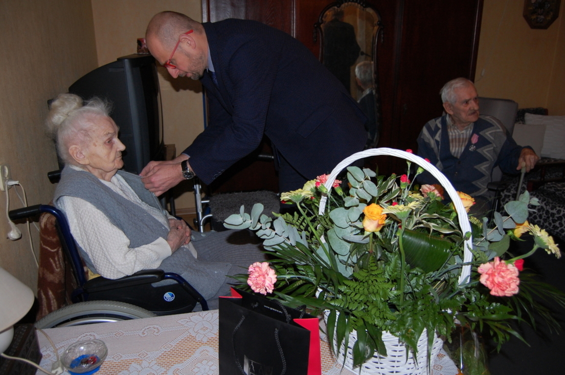 Prezydent wręczył małżonkom Medale za Długoletnie Pożycie Małżeńskie, których para nie odebrała 20 lat temu. Pogratulował także imponującego jubileuszu: siedemdziesięciolecia małżeństwa oraz wręczył okolicznościowy kosz kwiatów i upominek. Jubilaci cieszą się dobrym zdrowiem i są pod troskliwą opieką córki, zięcia, trzech wnuków oraz trojga prawnuków. Państwu Kołodziejskim życzymy sto lat i dużo zdrowia oraz pozytywnej energii na każdy dzień!