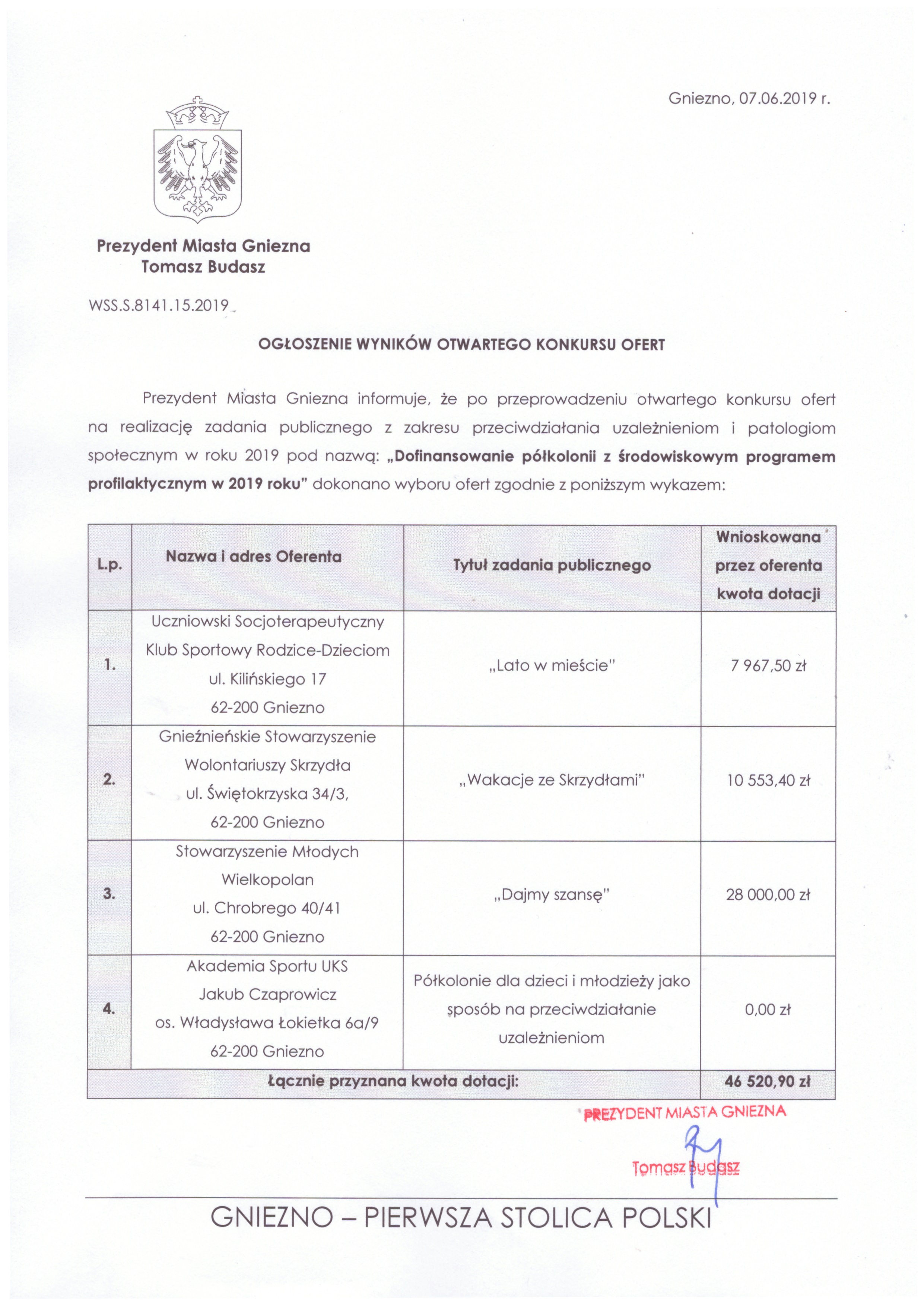 Prezydent Miasta Gniezna informuje, że po przeprowadzeniu otwartego konkursu ofert na realizację zadania publicznego z zakresu przeciwdziałania uzależnieniom i patologiom społecznym w roku 2019 pod nazwą: „Dofinansowanie półkolonii z środowiskowym programem profilaktycznym w 2019 roku” dokonano wyboru ofer. Szczegółowe informacje znajdują się w załączeniu.