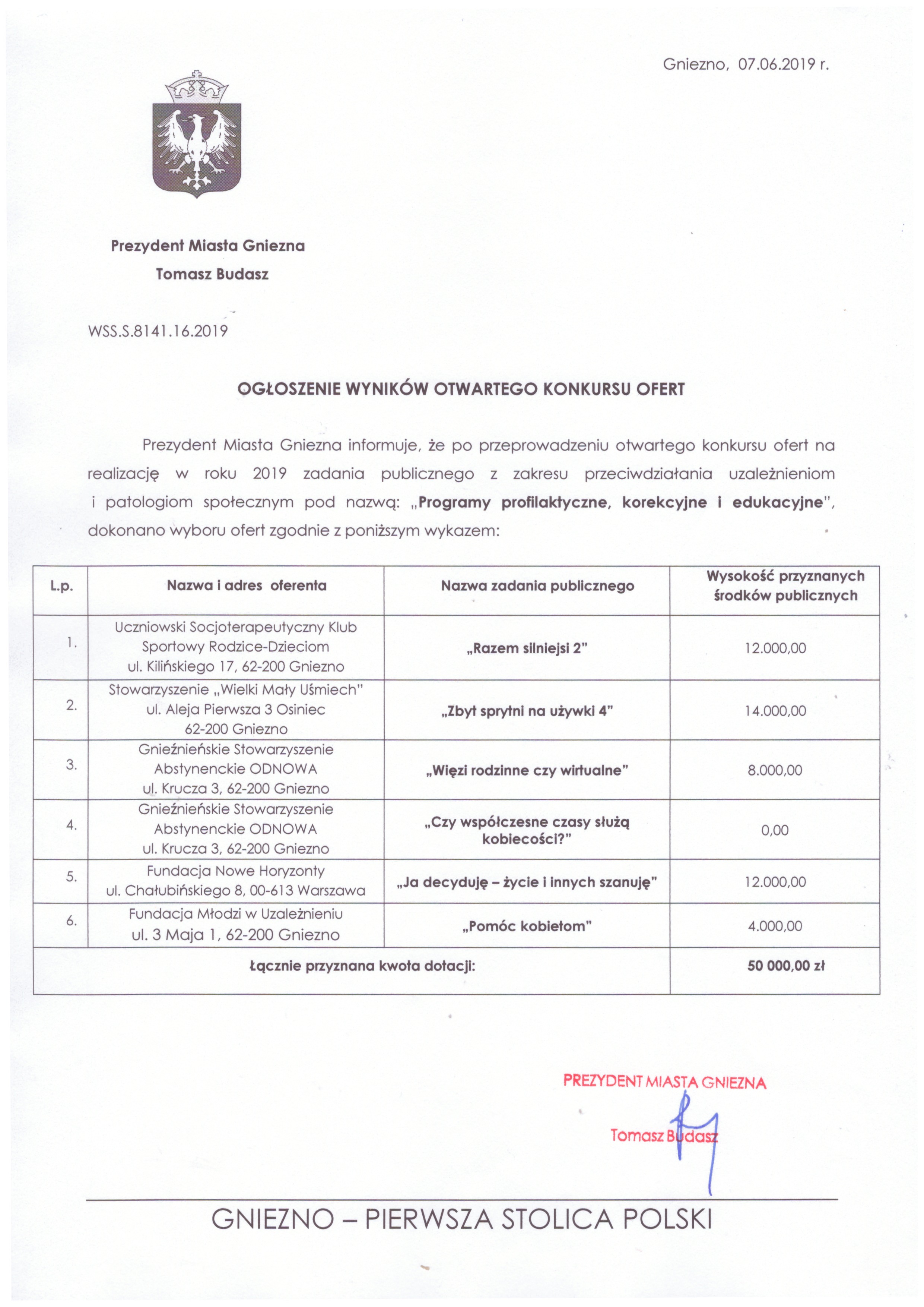 Prezydent Miasta Gniezna informuje, że po przeprowadzeniu otwartego konkursu ofert na realizację w roku 2019 zadania publicznego z zakresu przeciwdziałania uzależnieniom i patologiom społecznym pod nazwą: „Programy profilaktyczne, korekcyjne i edukacyjne”, dokonano wyboru ofer. Szczegółowe informacje znajdują się w załączeniu.