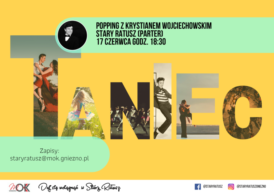 Popping to uliczny taniec stworzony w latach 70. XX w. najprawdopodobniej we Fresno (stan Kalifornia w USA), w społeczności afroamerykańskiej. Polega na szybkim spinaniu i rozluźnianiu mięśni (tzw. pop) w rytm muzyki w połączeniu z różnymi pozami i ruchami. Tancerz poppingu zwany jest popperem, a sam popping jest kojarzony z amerykańską kulturą i muzyką hip hop’ ową, choć pierwotnie tańczony był do funky, disco i muzyki elektronicznej. Uczestnicy warsztatów w Starym Ratuszu, poprowadzonych przez Krystiana Wojciechowskiego, będą mieli okazję poznać ten styl - jego podstawowe ruchu i kroki, aby samodzielnie rozpocząć przygodę z tym tańcem. Wstęp wolny/ obowiązują zgłoszenia na warsztaty: staryratusz@mok.gniezno.pl