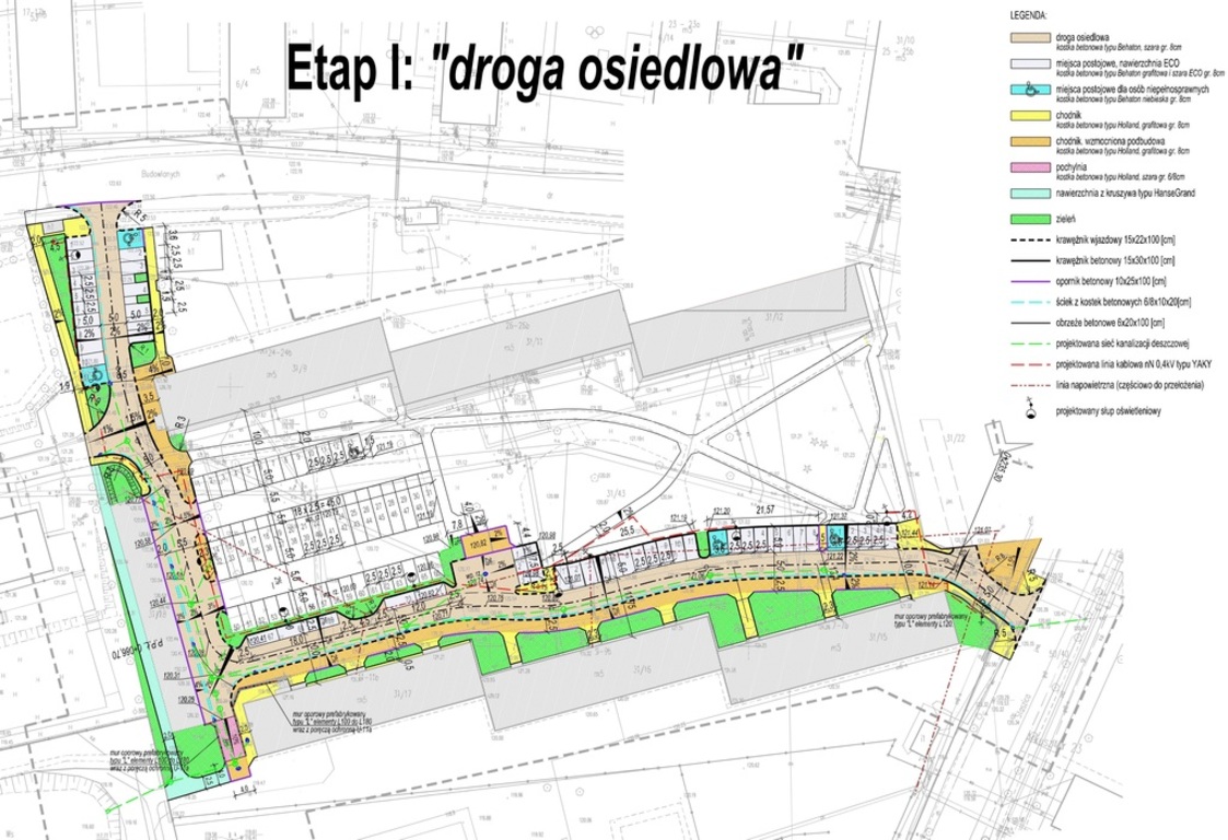 W roku 2020 wykonanych zostanie 66 miejsc postojowych, dwie drogi manewrowe oraz przylegające do parkingu chodniki. Zagospodarowane zostaną także przyległe tereny zielone oraz dokonane nasadzenia drzew i krzewów. Zamontowane zostaną także elementy małej architektury: huśtawki, bujawka, domek-zjeżdżalnia, psie pakiety, kosze na śmieci, ławki, trzepaki z linkami do prania.