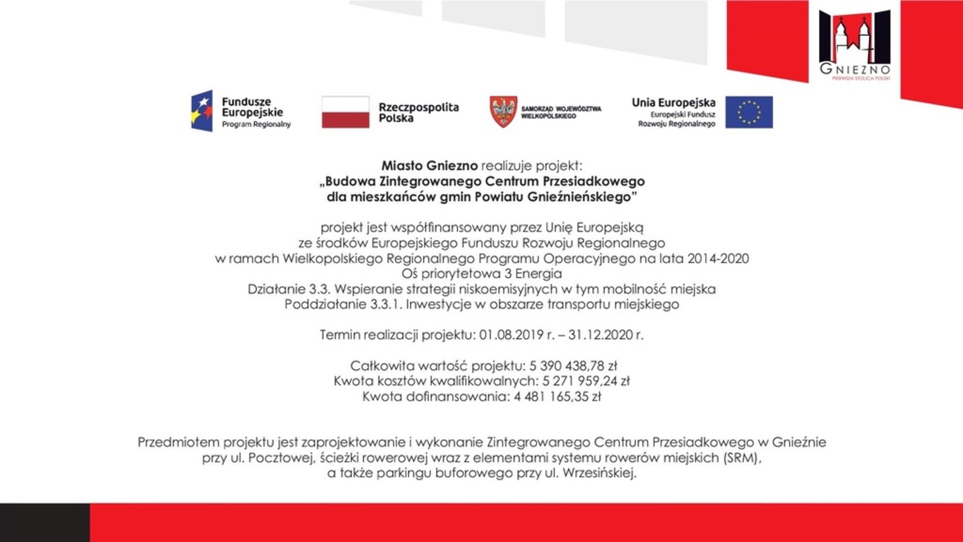 Zarząd Województwa Wielkopolskiego przyznał dofinansowanie unijne ze środków Europejskiego Funduszu Rozwoju Regionalnego w ramach Wielkopolskiego Regionalnego Programu Operacyjnego na lata 2014-2020 (WRPO 2014+) na wsparcie inwestycji na terenie Gnieźnieńskiego Obszaru Strategicznej Interwencji (GOSI). Projekt Miasta Gniezna „Budowa Zintegrowanego Centrum Przesiadkowego dla mieszkańców gmin Powiatu Gnieźnieńskiego” otrzymał 4.481.165,35 złotych dofinansowania.