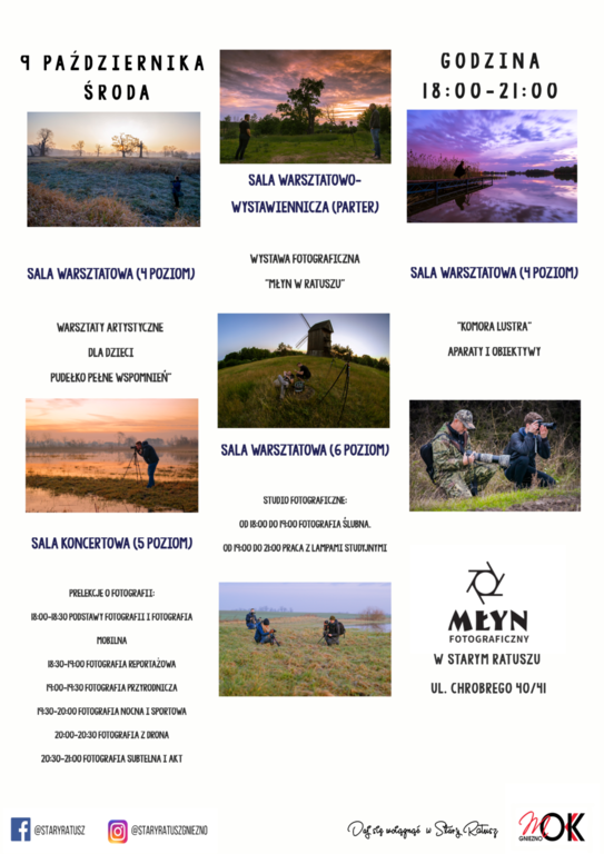 Zapraszamy wszystkich bez względu na wiek, poziom zaawansowania w fotografii. W Ratuszu tego dnia między 18-21 będzie się dział istny „młyn”. Szczegóły związane z harmonogramem wydarzenia na plakacie.W trakcie tego niecodziennego spotkania porozmawiać będzie można z członkami Klubu Fotograficzny Młyn w osobach Piotr Robakowski, Sebastian Uciński, Michał Koszela, Mariusz Jakubowski, Katarzyna Gołembowska, Sebastian Pawłowski, Tomasz Napierała.